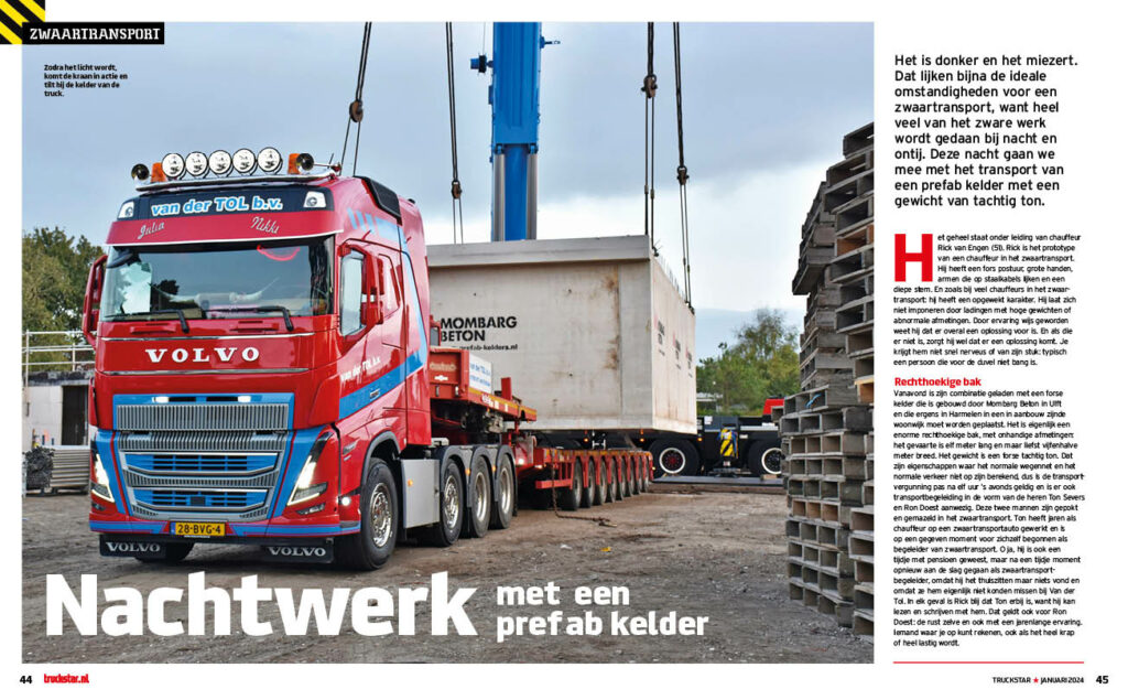 Oké, hier geen sneeuw en ijs, maar de omstandigheden tijdens een gemiddeld zwaartransport in Nederland liegen er ook niet om. Want heel veel van het zware werk wordt gedaan bij nacht en ontij. Ook nu is het donker en het miezert, kortom de gebruikelijke weersomstandigheden. We gaan mee met Rick van Engen die deze nacht op weg gaat met een prefab-kelder met een gewicht van tachtig ton. Dat doet hij in een nieuwe Volvo van Van der Tol. En die mag er wezen, zoals we bij daglicht kunnen constateren.