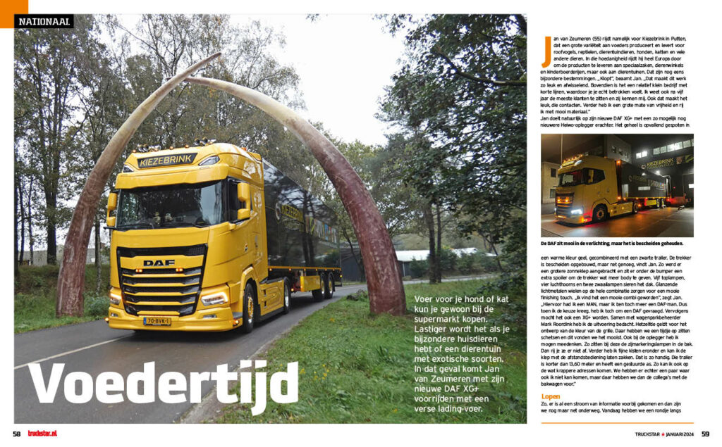 Diervoeder is een breed begrip. Van het bevoorraden van dierenwinkels tot het brengen van veevoeders op boerenerven. En meer, zoals we horen van Jan van Zeumeren die voor Kiezebrink uit Putten rijdt. Jan rijdt heel Europa door, ook naar kinderboerderijen en dierentuinen. „Dat maakt dit werk zo leuk en afwisselend. Ik weet ook na vijf jaar de meeste klanten te zitten en zij kennen mij. Ook dat maakt het leuk, die contacten. Verder heb ik een grote mate van vrijheid en rij ik met mooi materiaal.” Jan doelt daarmee op zijn nieuwe DAF XG+ met een zo mogelijk nog nieuwere Heiwo-oplegger erachter.