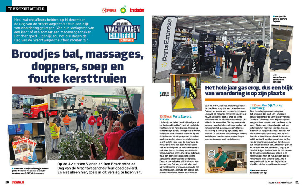 14 december was het de Dag van de Vrachtwagenchauffeur, de dag waarop ook dit jaar weer heel wat chauffeurs een blijk van waardering hebben gekregen: van klanten, leveranciers, werkgevers én van Truckstar. Wij gingen deze dag alweer voor het vierde achtereenvolgende jaar op pad om met meerdere teams chauffeurs te verrassen met 50 euro. Maar, eerlijk is eerlijk, tegen de broodjes-bal-actie van bp kunnen zelfs wij niet op: deze was voor iedere bp bezoekende chauffeur te scoren. Wat deze dag nog meer te beleven viel, lees je in deze Truckstar.