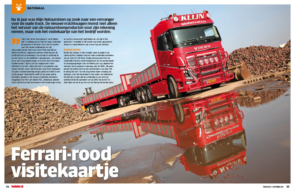 De nieuwe vrachtwagen van Klijn Natuursteen moest niet alleen het vervoer van de natuursteenproducten voor zijn rekening nemen, maar ook het visitekaartje van het bedrijf worden. En dat is prima gelukt, want de nieuwe Volvo FH 16 voldoet ruimschoots aan beide voorwaarden. Uitgevoerd in Ferrari-rood is het een blikvanger van jewelste en door het triple-stel, waarvan de voorste en achterste as stuurbaar zijn, heeft de truck een hoog laadvermogen terwijl hij ook heel wendbaar is.