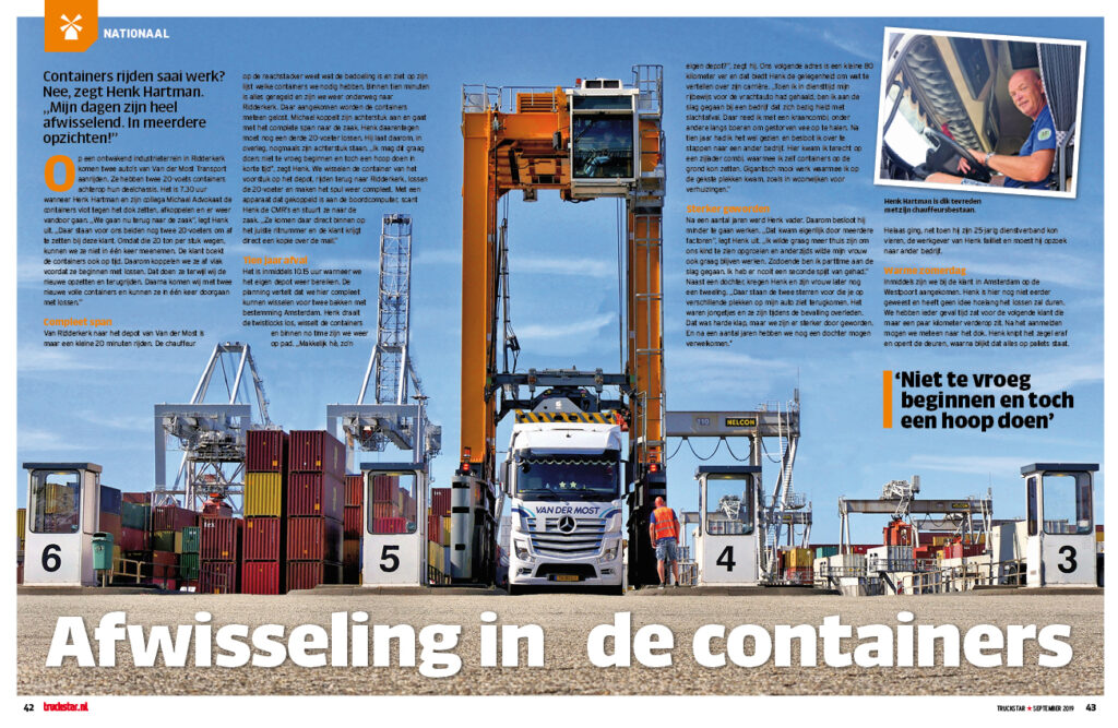 Containers rijden saai werk? Nee, meent Henk Hartman. ,,Het is heel druk maar ook lekker afwisselend.’’ Naast het rijden met zijn breker of combi-chassis gaat Henk ook regelmatig met een semi-dieplader voor containers met overhoogte of -breedte op pad.