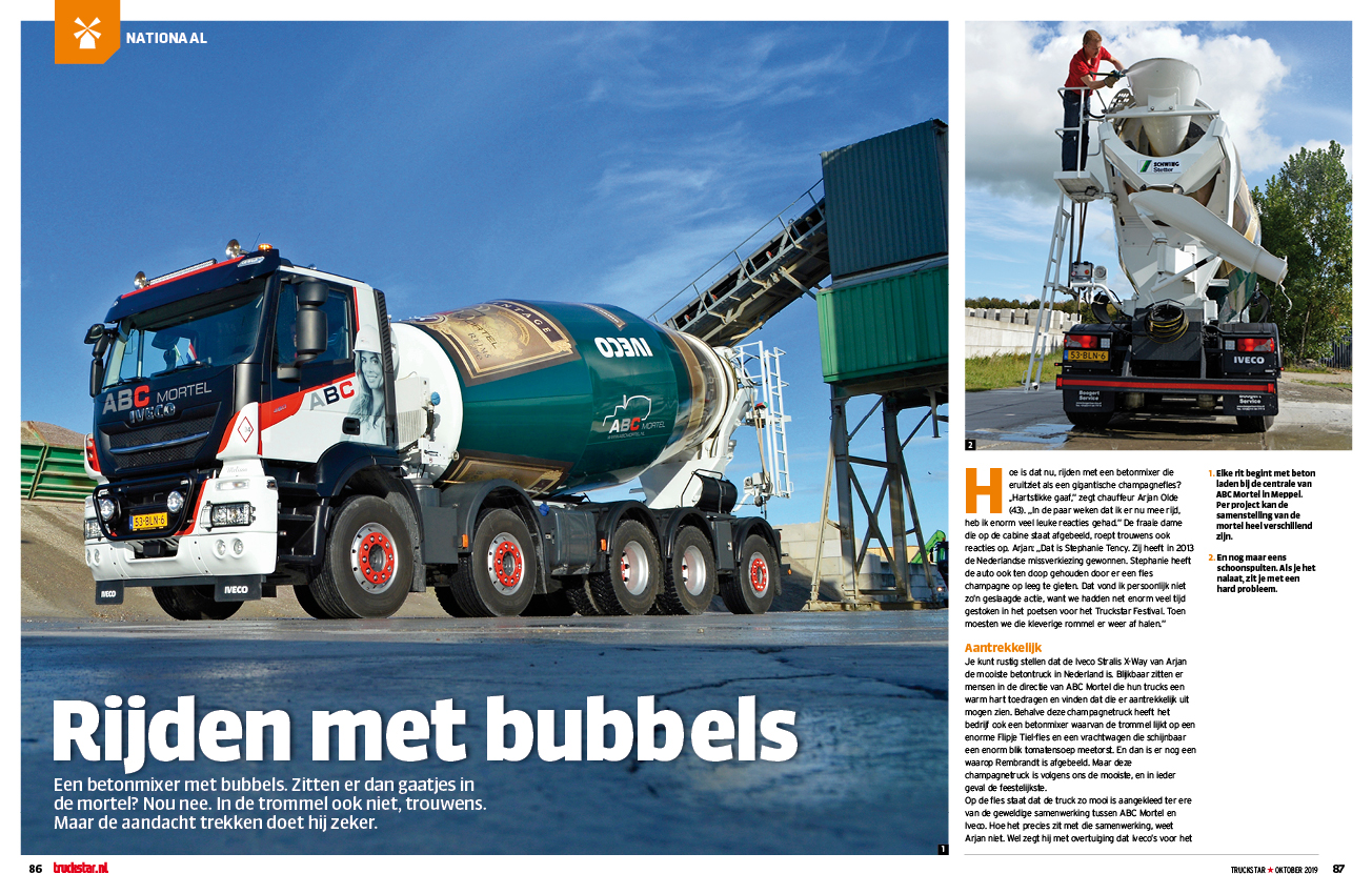 Verse mortel in een champagnefles: bij ABC in Meppel houden ze wel van een grapje. Want naast deze champagne truck rijden er meer bijzondere betonmixers rond, waaronder eentje waarvan de trommel lijkt op een enorme Flipje Tiel-fles. Maar deze is de mooiste, aldus Arjan Olde over zijn Iveco.