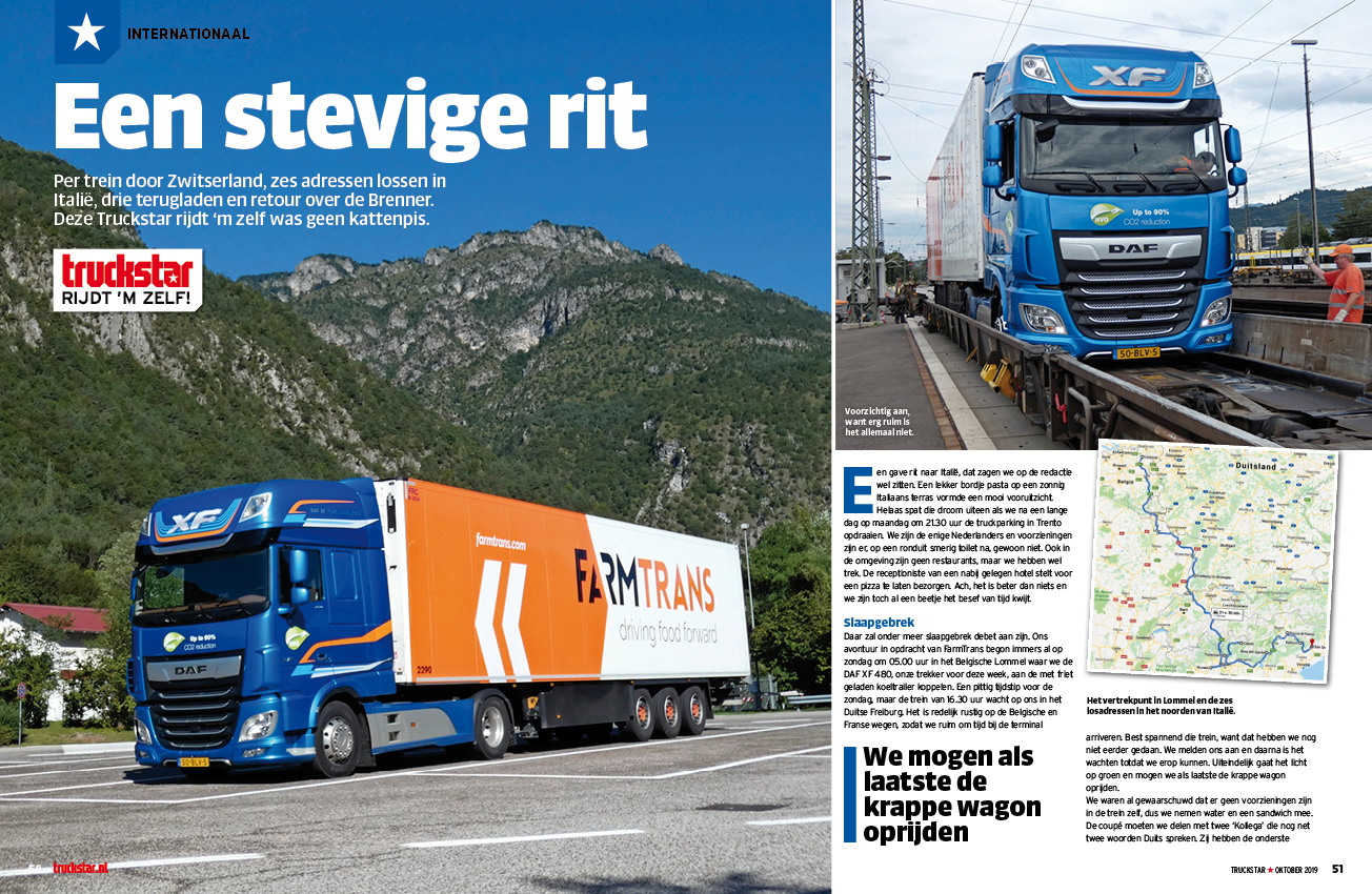 Met de trein door Zwitserland is geen aanrader, maar de rit door Noord-Italië met een DAF van FarmTrans doet dat leed snel vergeten. Alhoewel het wel aanpoten was met zes losadressen in Italie, drie laadadressen en een terugrit over de Brenner. Deze rijdt ‘m zelf verliep weliswaar wel plezierig, maar kon beslist geen plezierritje genoemd worden.