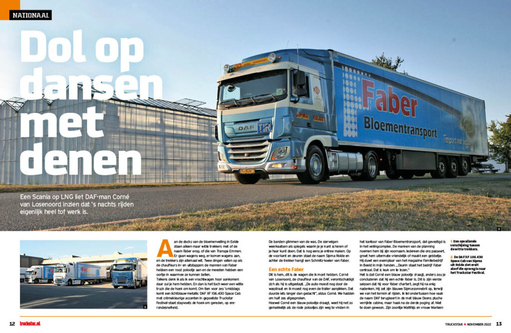 Aan de docks van de bloemenveiling in Eelde staan alleen maar witte vrachtwagens met of de naam Faber erop of die van Transpa Emmen. Opvallend: de mannen van Faber hebben een rood polootje aan. Om tien voor zes ’s middags komt een lichtblauw-metallic DAF XF 106.430 Space Cab stapvoets de hoek omgereden. De banden glimmen van de was. De siervelgen weerkaatsen als spiegels. Dat is nog eens je entree maken. Op de voorkant en deuren staat de naam Sipma Rolde en achter de trekker hangt een Schmitz-koeler van Faber. Dit is de wagen die ik moet hebben. Corné van Losenoord, de chauffeur van de DAF stapt uit, hij draagt een blauw polootje…