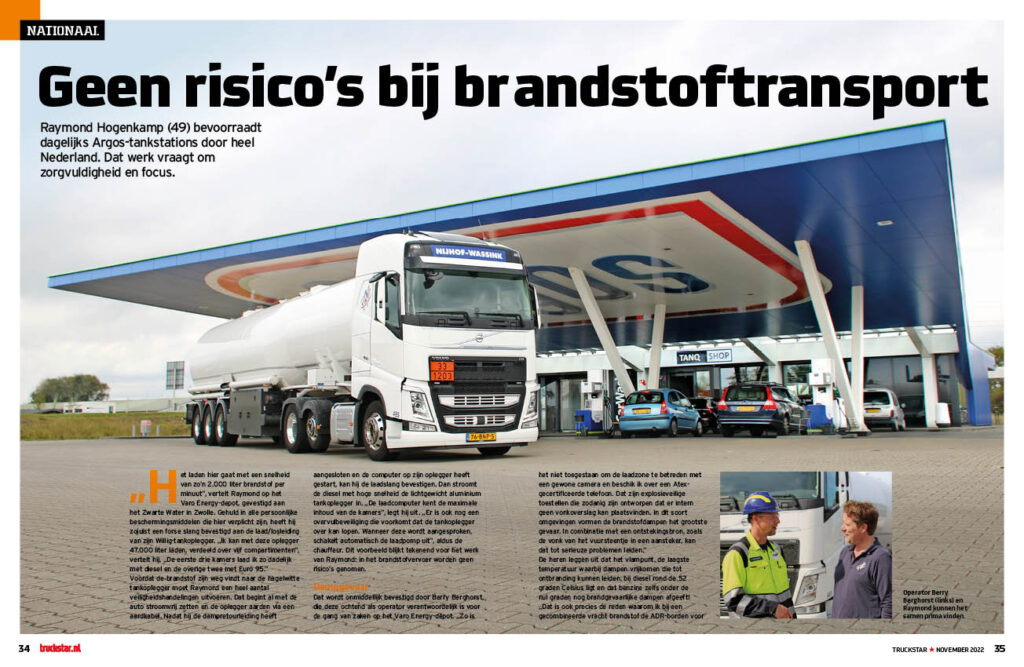 Voordat de brandstof zijn weg vindt naar de hagelwitte tankoplegger moet Raymond Hogenkamp een heel aantal veiligheidshandelingen uitvoeren. Dat begint al met de auto stroomvrij zetten en de oplegger aarden via een aardkabel. Nadat hij de dampretourleiding heeft aangesloten en de computer op zijn oplegger heeft gestart, kan hij de laadslang bevestigen. „De laadcomputer kent de maximale inhoud van de kamers”, legt hij uit. „Er is ook nog een overvulbeveiliging die voorkomt dat de tankoplegger over kan lopen. Wanneer deze wordt aangesproken, schakelt automatisch de laadpomp uit”, aldus Raymond. Hij bevoorraadt dagelijks Argos tankstations door heel Nederland, werk dat vraagt om zorgvuldigheid en focus.