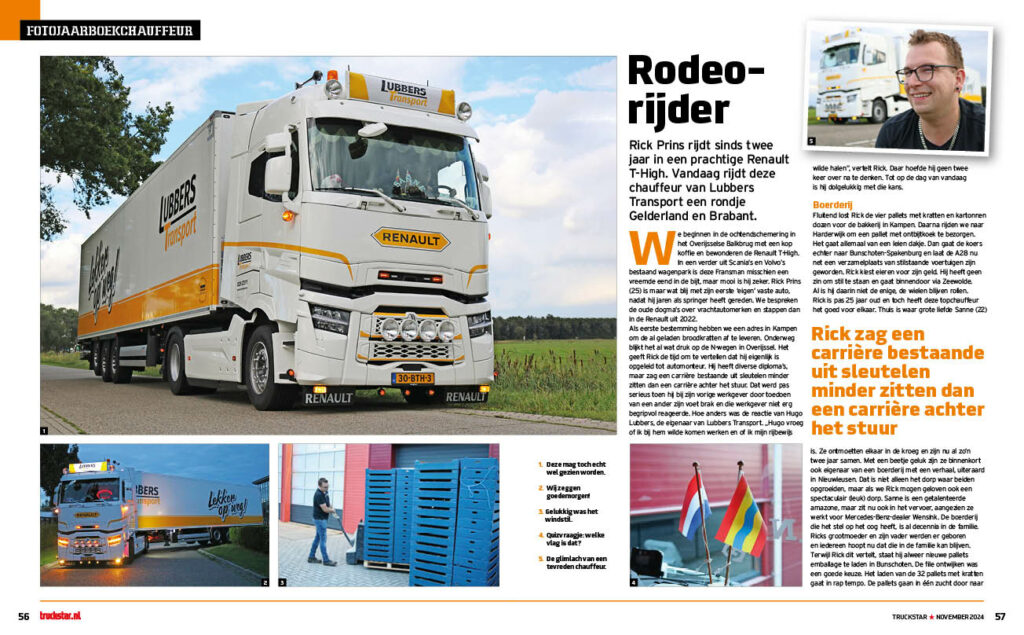 In een verder uit Scania’s en Volvo’s bestaand wagenpark is de Renault T-High van Rick Prins misschien een vreemde eend in de bijt, maar mooi is hij zeker. Rick is dan ook maar wat blij met zijn eerste ‘eigen’ vaste auto, nadat hij jaren als springer heeft gereden. We bespreken de oude dogma’s over vrachtautomerken en stappen dan in de Renault uit 2022.