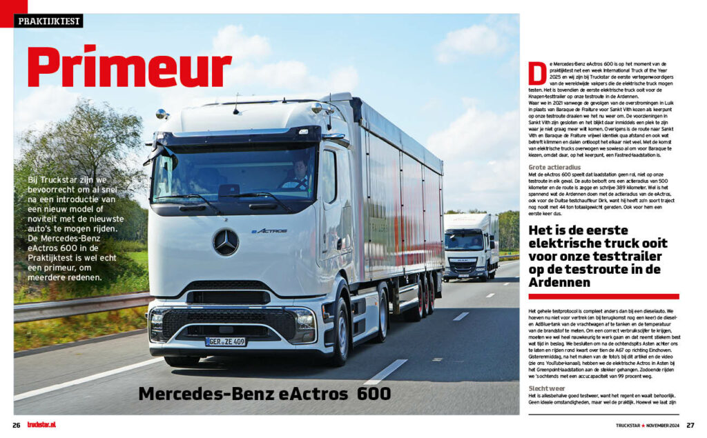 Ondertussen innoveert de transportsector lustig door. Zo maakten wij onze praktijktest met de Truck van het Jaar 2025, de Mercedes Actros E 600. Deze belooft ons een actieradius van 500 kilometer met 44 ton totaalgewicht. Een primeur! Ook de broers J.J. Jennissen zijn duurzaam bezig, en schaften naast hun Volvo FH Electric 4×2 trekker twee nieuwe FH Aero trekkers aan. Haaks daarop staat dan weer het wagenpark van Günter Jung, bestaande uit maar liefst zeven neuzige Amerikanen met evenzoveel kippers. Maar, wees gerust, de uitstoot blijft ook in zijn Duitse groeve zeer beperkt.