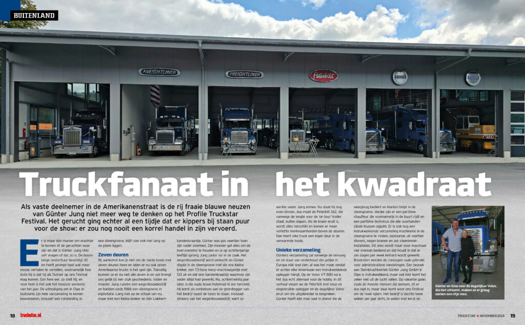 Als vaste deelnemer in de Amerikanenstraat is de rij fraaie blauwe neuzen van Günter Jung niet meer weg te denken op het Profile Truckstar Festival. Maar de chauffeurs ontbraken. Het gerucht ging dan ook dat er met deze kippers niet gewerkt wordt. Er is maar één manier om erachter te komen of de geruchten waar zijn en dat is Günter Jung zelf vragen of dat zo is. Die nodigde ons prompt uit om in Olpe in Duitsland zijn hele verzameling te komen bewonderen, inclusief een rondleiding in een steengroeve. Zeg daar eens nee tegen.