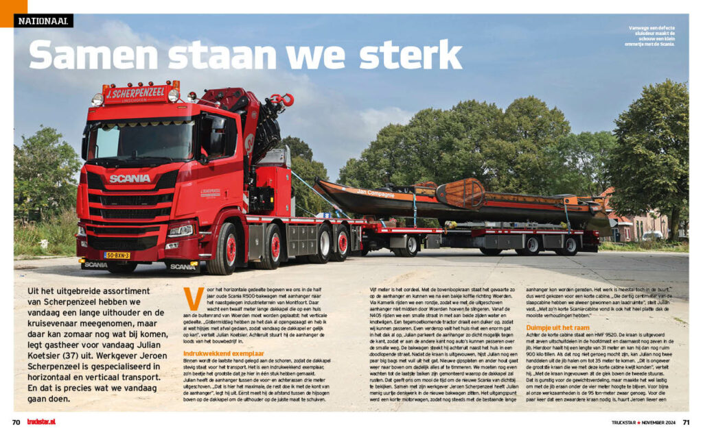 Voor het horizontale gedeelte gaan we in de half jaar oude Scania R500-bakwagen met aanhanger naar het industrieterrein van Montfoort. Daar wacht een twaalf meter lange dakkapel die op een huis aan de buitenrand van Woerden moet worden geplaatst: het verticale gedeelte.