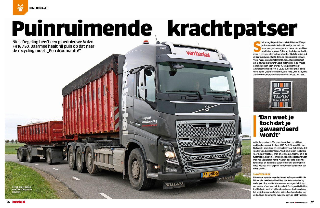 Puinruimen met een droomauto. Voor Niels Degeling is dat de realiteit, ook al had hij aan zijn werkgever te kennen gegeven dat hij wel wat voelde voor een nieuwe FH 16 750. Dat hij nu achter het stuur zit van een spiksplinternieuwe Volvo, dat is toch een verrassing. “dan weet je toch dat je gewaardeerd wordt.”