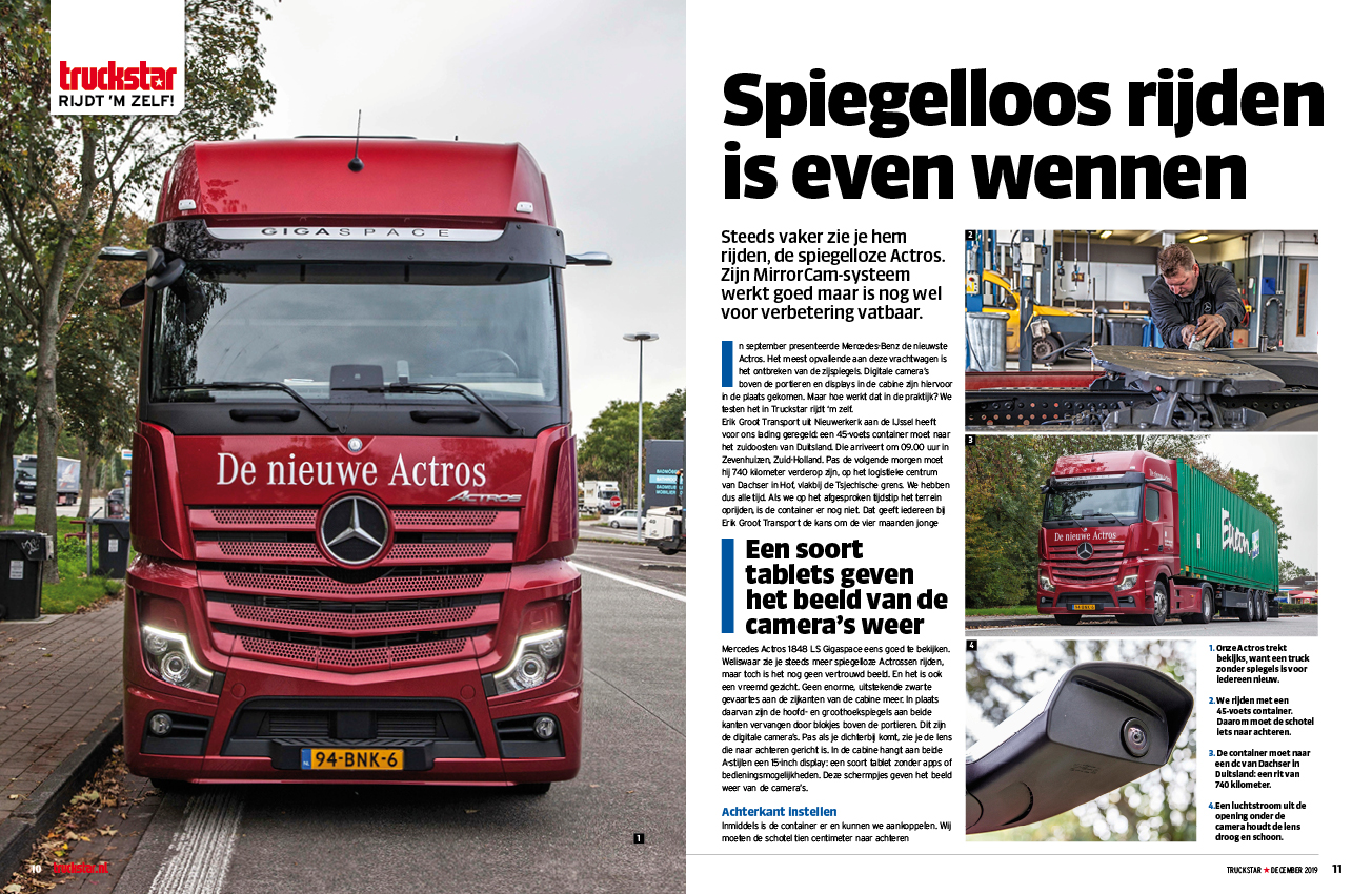Benieuwd naar hoe dat nu in de praktijk werkt, reden we dit keer met de spiegelloze Actros 1848 LS Gigaspace met een 45-voetsscontainer naar Zuid-Duitsland. Het is wel even wennen en hier en daar nog voor verbetering vatbaar, maar de branstofbesparing is niet mis en daar is ook wat voor te zeggen.