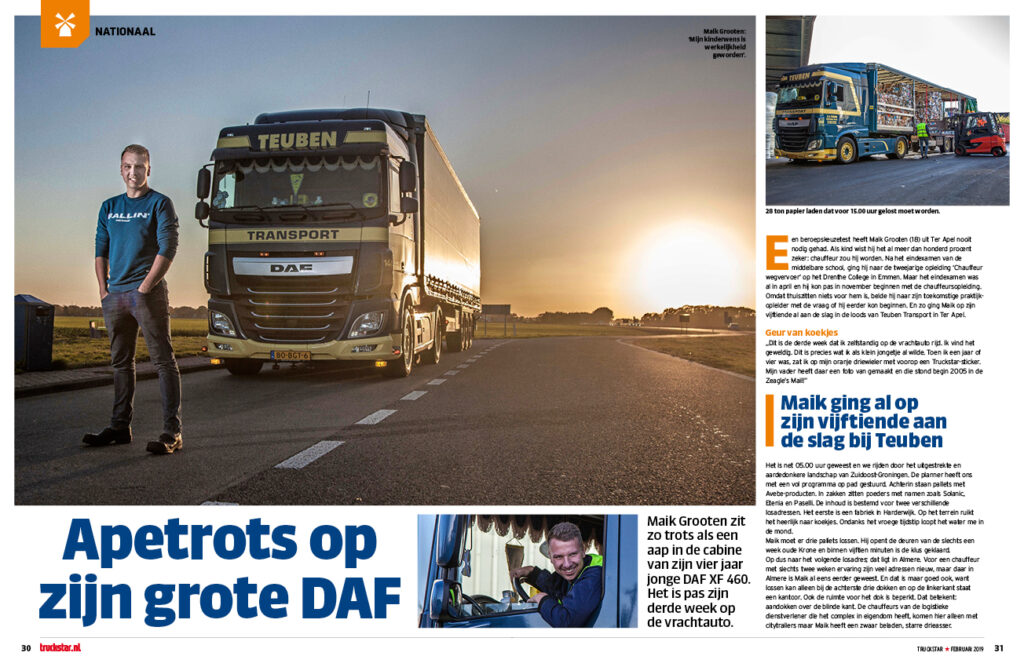 Slechts week na zijn achttiende verjaardag slaagde Maik Grooten voor het C-rijbewijs en vervolgens voor het E-gedeelte. Nu vinden we hem achter het stuur van een supermooie DAF XF Super Space Cab. Daarmee is de trotse Maik sinds een kleine drie weken voor Teuben in de weer met papier.