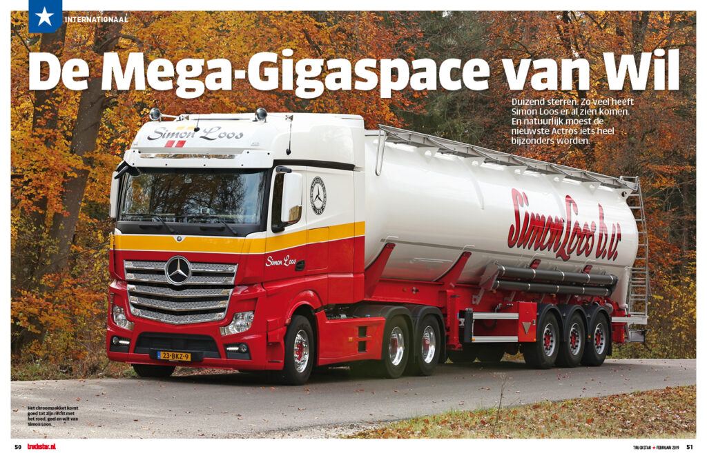 De 1.000ste Mercedes die bij Simon Loos in dienst kwam, moest iets bijzonders worden. Dat werd een Actros waarvan de cabine met 90 centimeter werd verlengd. Chauffeur Wil Delissen is er danig mee in zijn sas.