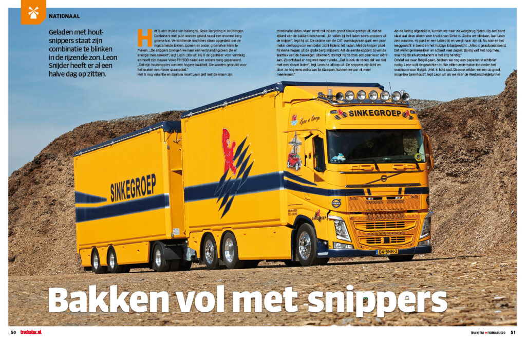 Leon komt eigenlijk van de bloemenwagen af. Maar met een gezin op komst wilde hij meer thuis zijn en dus stapte hij over op ander werk. Nu rijdt hij voor Sinke met houtsnippers. “Ik doe dit al bijna negen jaar. In het begin reed ik met twee 40-kuubs bakken heen en weer.” Maar het aantal vrachten werd groter en daarom kwam er een Volvo FH met Walking Floor-oplegger. “Een combinatie waarmee ik in één keer 92 kubieke meter mee kan nemen.”