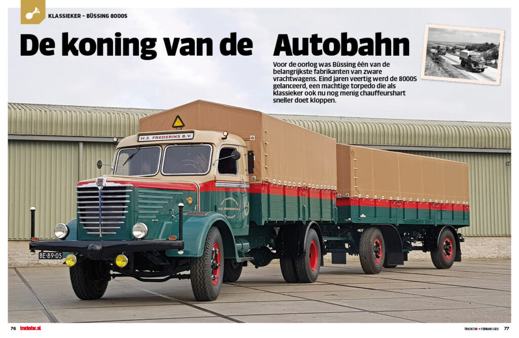 Voor de oorlog was Büssing één van de belangrijkste fabrikanten van zware vrachtwagens. En hoewel de verschrikkingen van de Tweede Wereldoorlog nog vers in het geheugen lagen, waren Nederlandse vervoerders na de oorlog alweer rap belangrijke afnemers van Duitse ‘Lastwagens’. Zoals de 8000S, die eind jaren 40 werd gelanceerd. Een machtige torpedo die als klassieker nu ook nog menig chauffeurshart sneller doet kloppen.
