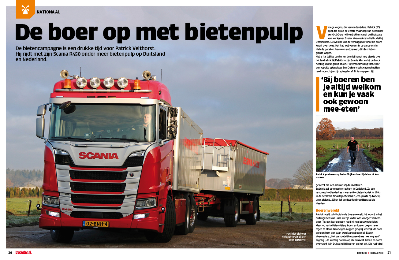 Het zijn vroege vogels, die veevoederrijders. Zo ook Patrick Velthorst die op een fonkelnieuwe Scania R450 onder meer met bietenpulp op Duitsland rijdt. Wanneer we van de thuisbasis in Halle vertrekken is het dan ook nog hartstikke donker. Daardoor zie ik de kapotte spiegelkap niet. Een Duitse vrachtwagenchauffeur reed deze recent eraf en er is nog geen tijd geweest om een nieuwe kap te monteren.