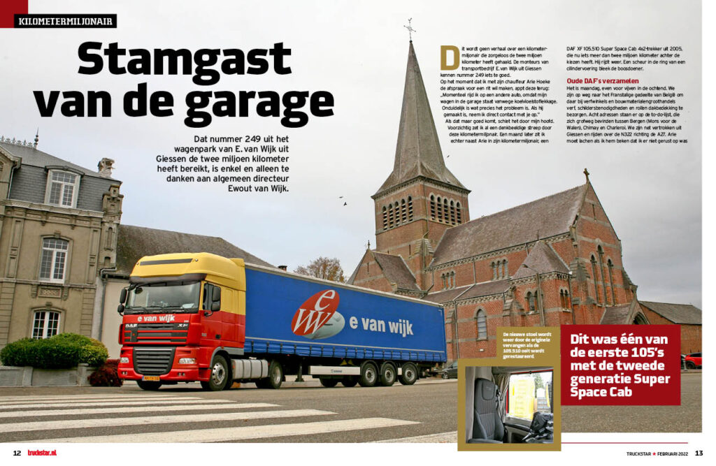 Dit wordt geen verhaal over een kilometermiljonair die zorgeloos de twee miljoen kilometer heeft gehaald. Daarvoor kennen de monteurs van transportbedrijf E. van Wijk uit Giessen nummer 249 iets te goed. Als dat maar goed komt, schiet het door mijn hoofd als ik naast Arie in zijn kilometermiljonair, een DAF XF 105.510 Super Space Cab 4×2-trekker uit 2005, plaatsneem. Toen hij zes jaar geleden van de planning de vraag kreeg of hij vast met nummer 249 wilde gaan rijden hoefde hij daar geen seconde over na te denken. Hoe kun je zo enthousiast reageren op een trekker waar eigenlijk al het beste van af is? Arie begint aan zijn opsomming van argumenten.