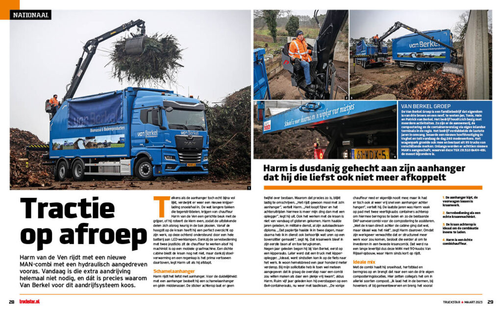 Harm van de Ven rijdt het liefst met aanhanger. Voor de duidelijkheid: met een aanhanger bedoelt hij een schamelaanhanger en géén middenasser. De sticker achterop laat er geen twijfel over bestaan. Waarom dat precies zo is, blijkt lastig te omschrijven. „Het rijdt gewoon mooi met zo’n aanhanger”, vertelt Harm. „Het loopt fijner en het achteruitrijden hiermee is meer mijn ding dan met een oplegger”, legt hij uit. Negen jaar geleden begon hij bij Van Berkel, eerst op een kipperauto. Later werd dat een truck met kipperoplegger.