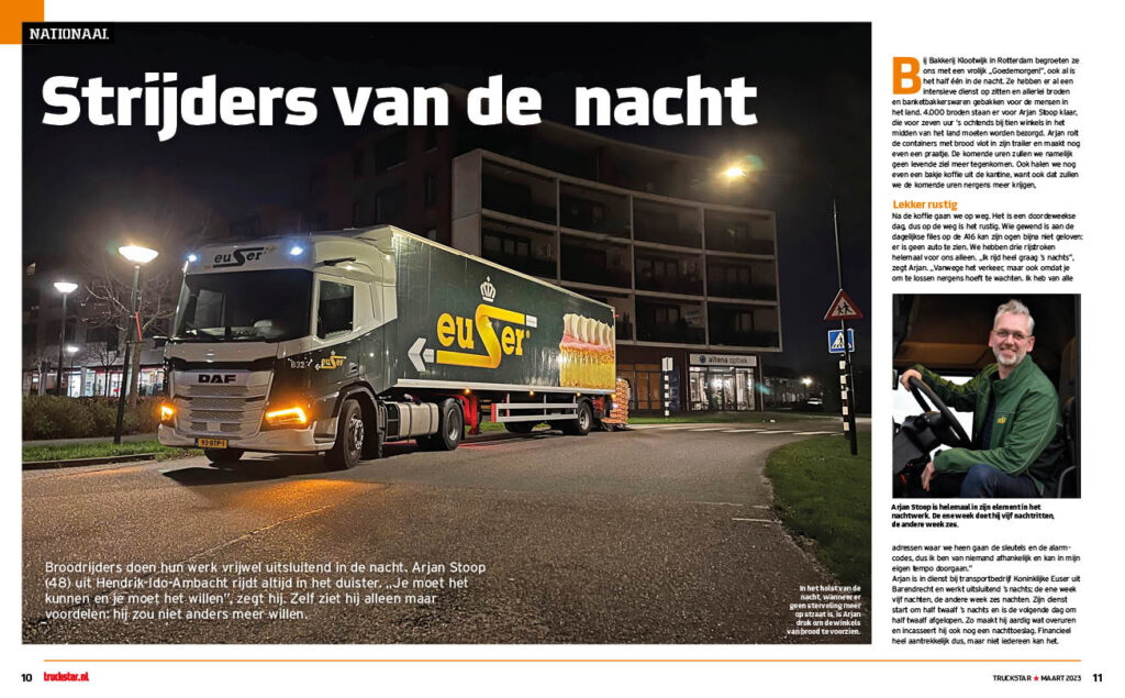 Ik ga om half twaalf ’s middags naar huis, doe eventueel een boodschapje, eet een hapje, ga douchen en naar bed. Dan slaap ik tot ongeveer half zes, want ik wil ’s avonds wel gewoon met mijn vrouw aan tafel zitten. ’s Avonds pak ik dan nog twee uurtjes slaap en dan spring ik in mijn auto en rijd naar Euser.” Arjan Stoop rijdt altijd in het duister. „Je moet het kunnen en je moet het willen”, zegt hij.