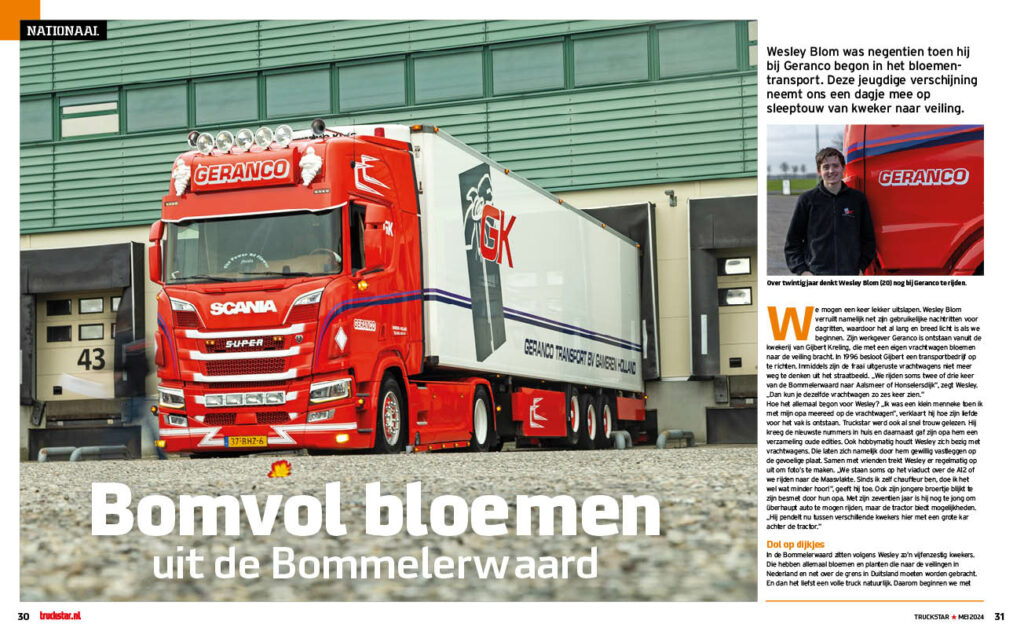We mogen een keer lekker uitslapen. Wesley verruilt namelijk net zijn gebruikelijke nachtritten voor dagritten, waardoor het al lang en breed licht is als we beginnen. Wesley rijdt bloemen voor zijn werkgever Geranco, wiens fraai uitgeruste vrachtwagens het straatbeeld in deze omgeving bepalen. „We rijden soms twee of drie keer van de Bommelerwaard naar Aalsmeer of Honselersdijk”, zegt Wesley. „Dan kun je dezelfde vrachtwagen zo zes keer zien.” En dat is geen straf…