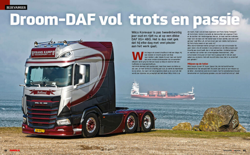 Als je Wilco tien jaar geleden had gevraagd in wat voor auto hij later zou gaan rijden, had hij nooit DAF gezegd. „Van kleins af aan was ik Scania-man, maar nu ik zelf chauffeur ben en op een DAF rijd, zou ik niets anders willen. Vooral aan de ruimte wen je heel snel.’’ De auto is een echte blikvanger. „Sinds ik met deze auto rijd, wordt er veel naar me geknipperd en gezwaaid.’’ Hij en zijn schoonvader hebben dan ook stevig uitgepakt.