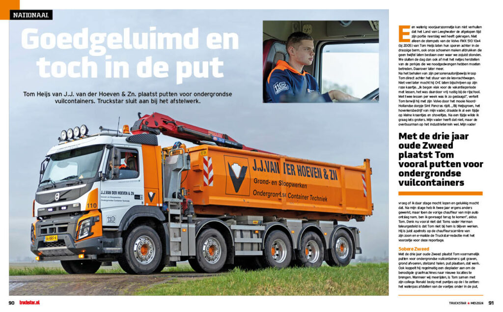 Met zijn drie jaar oude Volvo FMX plaatst Tom voornamelijk putten voor ondergrondse vuilcontainers: gat graven, grond afvoeren, stelzand halen, put plaatsen, dat werk. Ook koppelt hij regelmatig een dieplader aan om de benodigde graafmachines naar nieuwe locaties te brengen. Wanneer wij meerijden, is Tom samen met zijn collega Ronald bezig met het waterpas afstellen van de voetjes onder in de put, waardoor de containers mooi gelijk met het straatwerk komen te liggen.