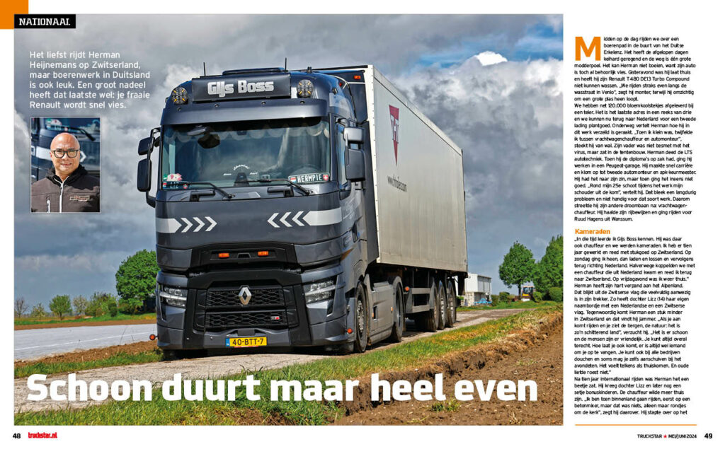 Midden op de dag rijden we over een boerenpad in de buurt van het Duitse Erkelenz, waar Herman Heijnemans net 120.000 bloemkoolstekjes heeft afgeleverd bij een boer. Het heeft de afgelopen dagen keihard geregend en de weg is één grote modderpoel. Gisteravond was hij laat thuis en heeft hij zijn Renault T 480 DE13 Turbo Compound niet kunnen wassen. „We rijden straks even langs de wasstraat in Venlo”, zegt hij monter, terwijl hij omzichtig om een grote plas heen loopt.