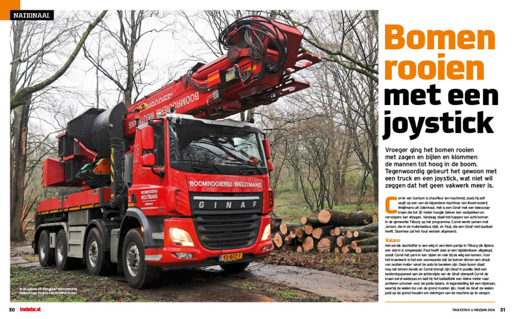 Corné van Gorkum is chauffeur op een van de bijzondere machines van Boomrooierij Weijtmans uit Udenhout. Een Ginaf met een telescoopkraan die tot 32 meter hoogte takken kan vastpakken en vervolgens kan afzagen. In tegenstelling tot vroeger, toen de mannen tot hoog in de boom kommen met zagen en bijlen, gaat dat tegenwoordig gewoon met een truck en een joystick. Vandaag staat het kappen van acht bomen in de gemeente Tilburg op het programma.