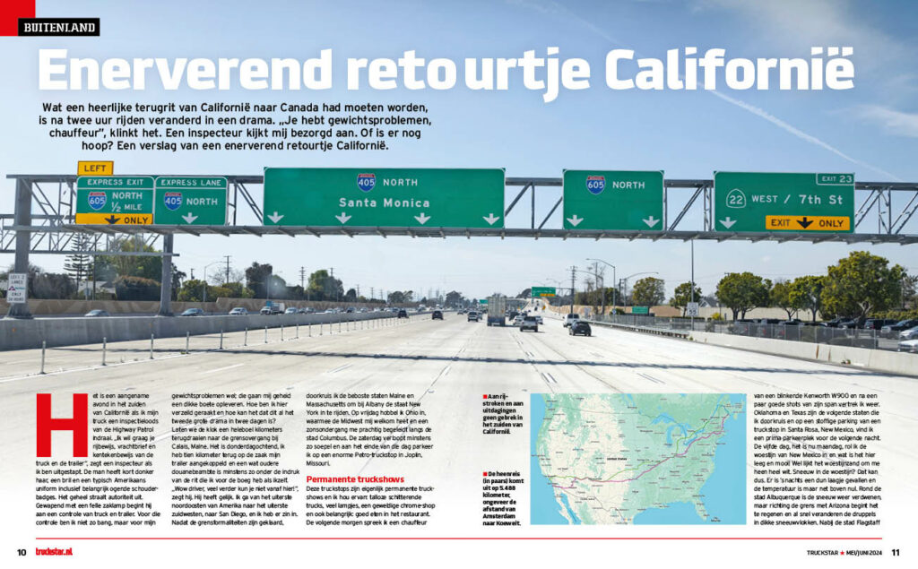 Het is donderdagochtend, ik heb op de zaak mijn trailer aangekoppeld en een wat oudere douanebeambte is onder de indruk van de rit die ik voor de boeg heb. „Wow driver, veel verder kun je niet vanaf hier!”, zegt hij. Hij heeft gelijk. Ik ga van het uiterste noordoosten van Amerika naar het uiterste zuidwesten, naar San Diego, en ik heb er zin in. Wij ook: in dit nummer rijden we mee met Korneel Luth in een Standplaats Canada XXL.