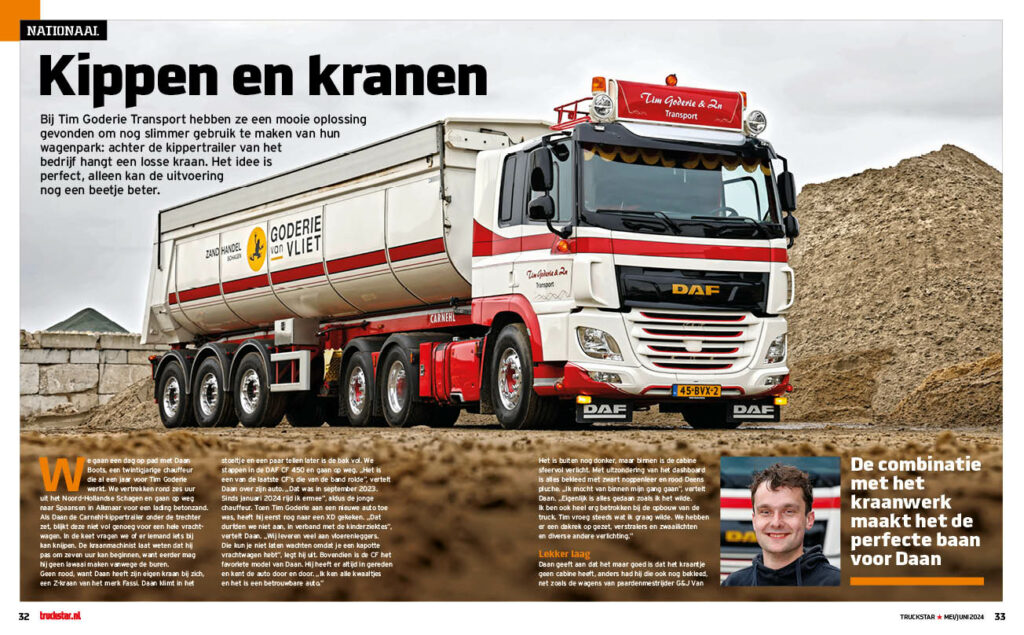 We gaan een dag op pad met Daan Boots, een twintigjarige chauffeur die al een jaar voor Tim Goderie werkt. Zij hebben een mooie oplossing gevonden om nog slimmer gebruik te maken van hun wagenpark: achter de kippertrailer van het bedrijf hangt een losse kraan. Een Z-kraan van het merk Fassie. Het idee is perfect, alleen kan de uitvoering nog een beetje beter.