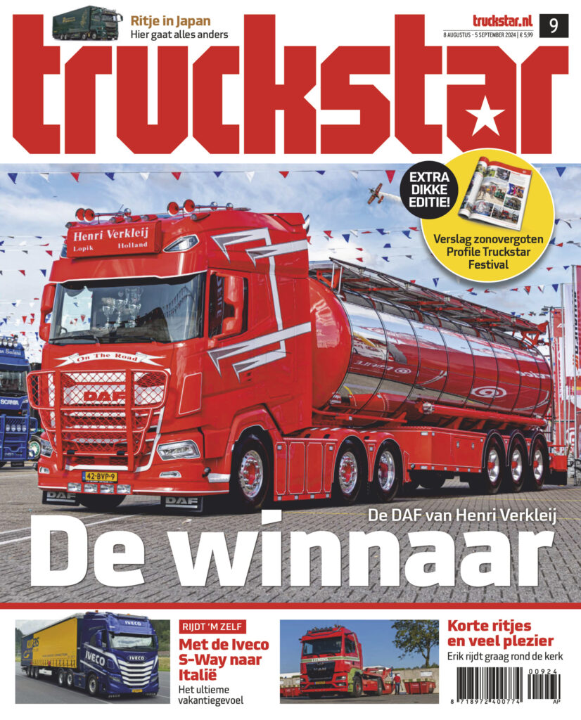 Zo ontmoeten we in Japan Jun Kato met wie we een rit voor TP Service meemaken. Rijden we zelf met de Iveco S-Way naar het zonnige Italië en volgen we Frank Kersten die met zijn Mercedes riviercruiseschepen in Frankrijk bevoorraad. In eigen land bewonderen we de nieuwe DAF XD van Ron Vonk, maken we kennis met de FM van Terberg en rijden we zwaaiend rond kerk met Erik Ekkel. Dit alles en nog veel meer vind je in nummer 9-2024 van Truckstar. Kijk voor een uitgebreide preview hieronder. Je kunt nummer 9 nu online of in de winkel kopen. Maar wil je nooit meer iets missen, word dan abonnee – dan ontvang je alle nummers van Truckstar én de Specials gewoon thuis in de brievenbus.