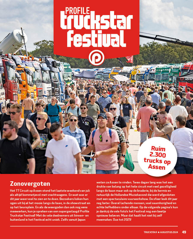 Met de vele deelnemers uit binnen- en buitenland is het Profile Truckstar Festival echt uniek. Zelfs vanuit Japan weten ze Assen te vinden. Bezoekers keken hun ogen dan ook uit bij al het moois langs de baan, in de showstraat en op het beursplein. En als de weergoden dan ook nog eens meewerken, kun je spreken van een supergeslaagd Truckstar Festival!