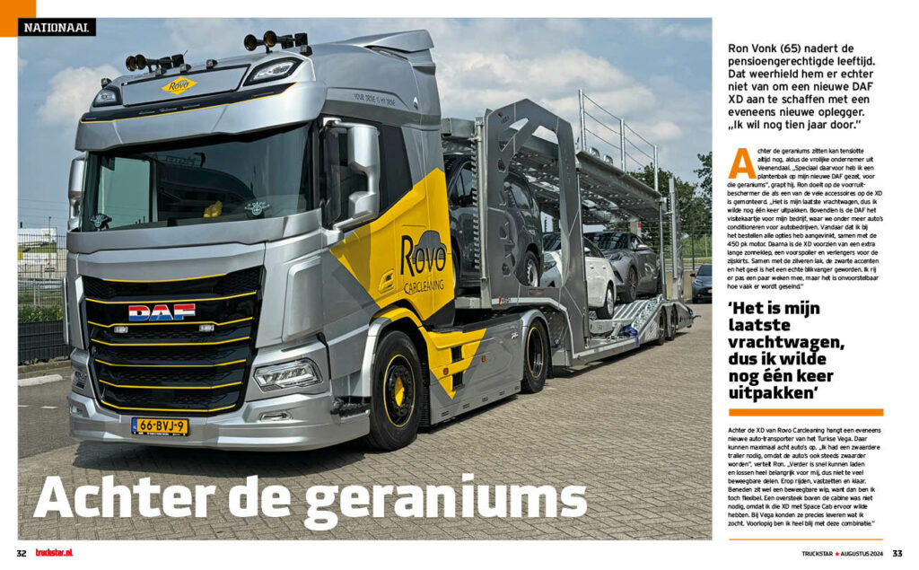 „Het is mijn laatste vrachtwagen, dus ik wilde nog één keer uitpakken’’, aldus Ron Vonk. ,,Vandaar dat ik bij het bestellen alle opties heb aangevinkt, samen met de 450 pk motor. Ook is de XD daarna voorzien van een extra lange zonneklep, een voorspoiler en verlengers voor de zijskirts. Samen met de zilveren lak, de zwarte accenten en het geel is het een echte blikvanger geworden. Ik rij er pas een paar weken mee, maar het is onvoorstelbaar hoe vaak er wordt geseind.”