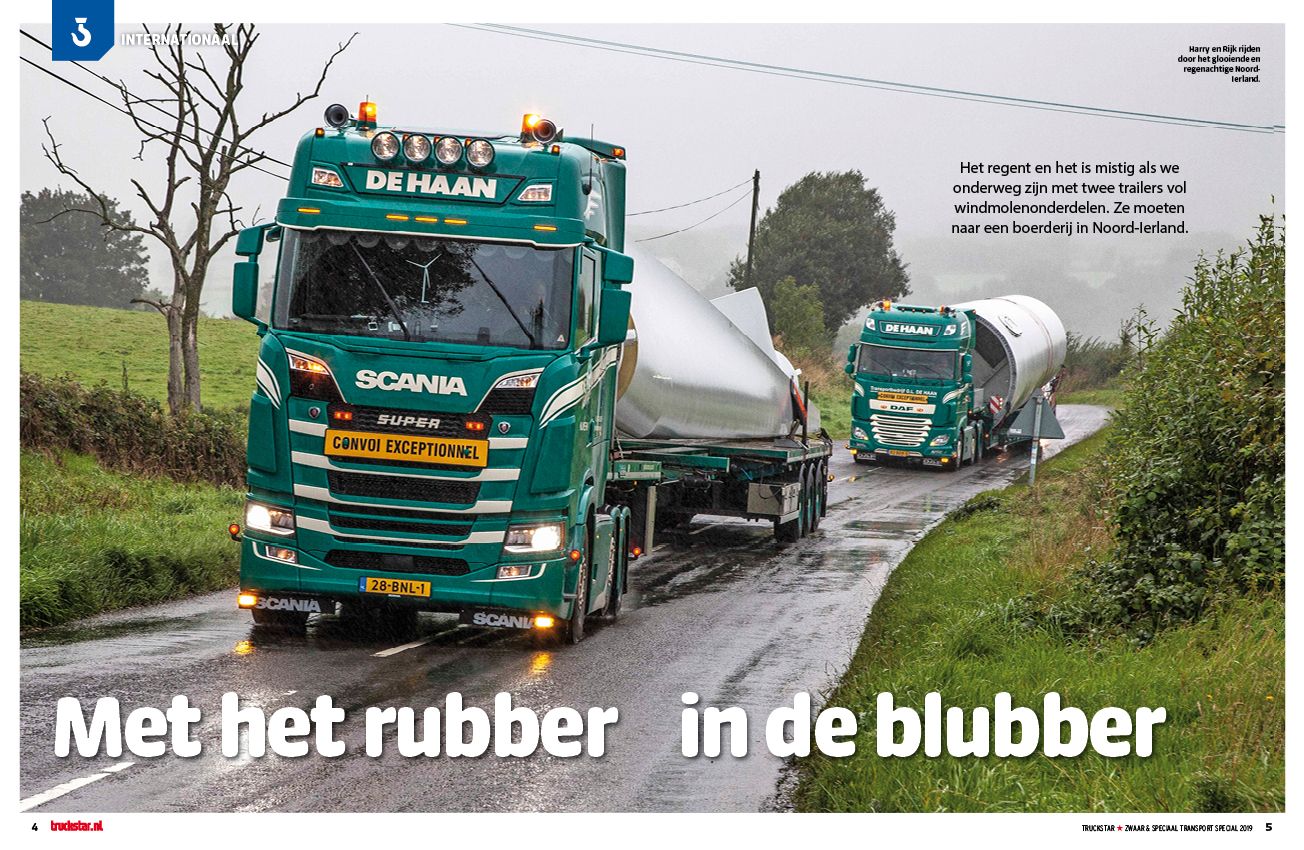 Het regent en het is mistig als we onderweg zijn met twee trailers vol windmolenonderdelen. Ze moeten naar een boerderij in Noord-Ierland. De zes weken jonge Scania S450 6×2 en de DAF XF 460 6×2 van Transportbedrijf G. L. de Haan uit Nijkerk moeten door de modder een heuvel op, het eerste deel van het pad omhogg is van beton. Maar dan houdt het beton op en bestaat de ondergrond nog slechts uit modder en losse stenen. De wielen van de Scania beginnen dan al snel te slippen en de combinatie komt tot stilstand. Wat nu?