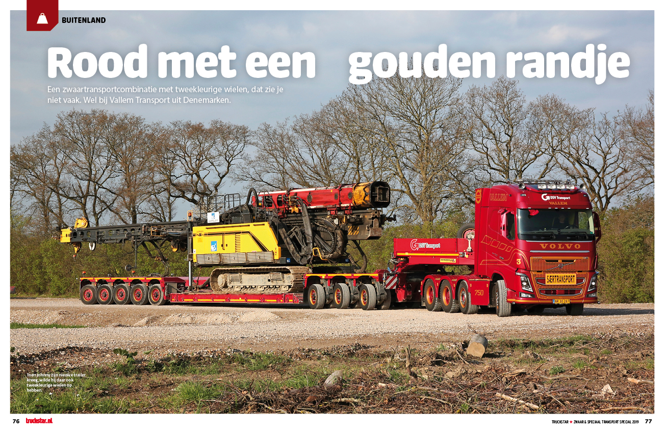 De rode Volvo, met gouden randje, is een plaatje om te zien. Een zwaartransportcombinatie met tweekleurige wielen, dat zie je niet vaak. Wel bij Vallem Transport uit Denemarken.