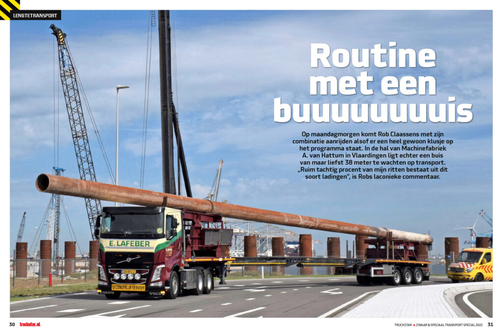 Op maandagmorgen komt Rob Claassens met zijn combinatie aanrijden alsof er een heel gewoon klusje op het programma staat. In de hal van Machinefabriek A. van Hattum in Vlissingen ligt echter een buis van maar liefst 38 meter te wachten op transport.