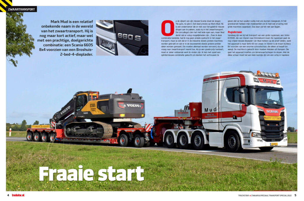 Mark Mud is een relatief onbekende naam in de wereld van het zwaartransport. Hij is nog maar kort actief, maar wel met een prachtige, doelgerichte combinatie: een Scania 660S 8×4 voorzien van een Broshuis 2-bed-4-dieplader.