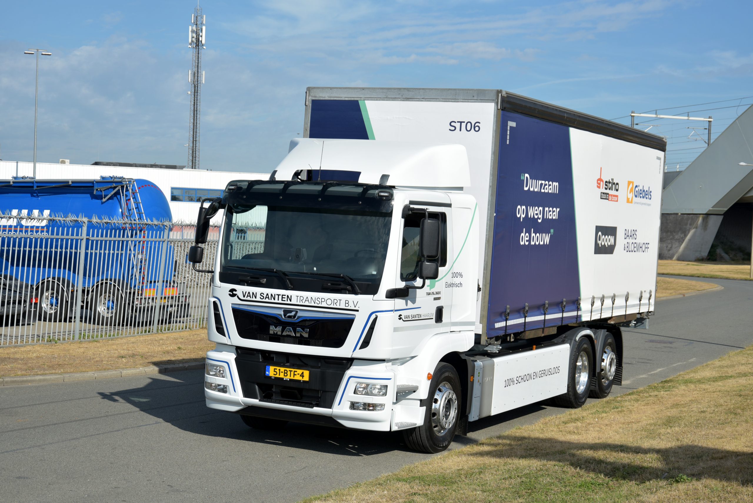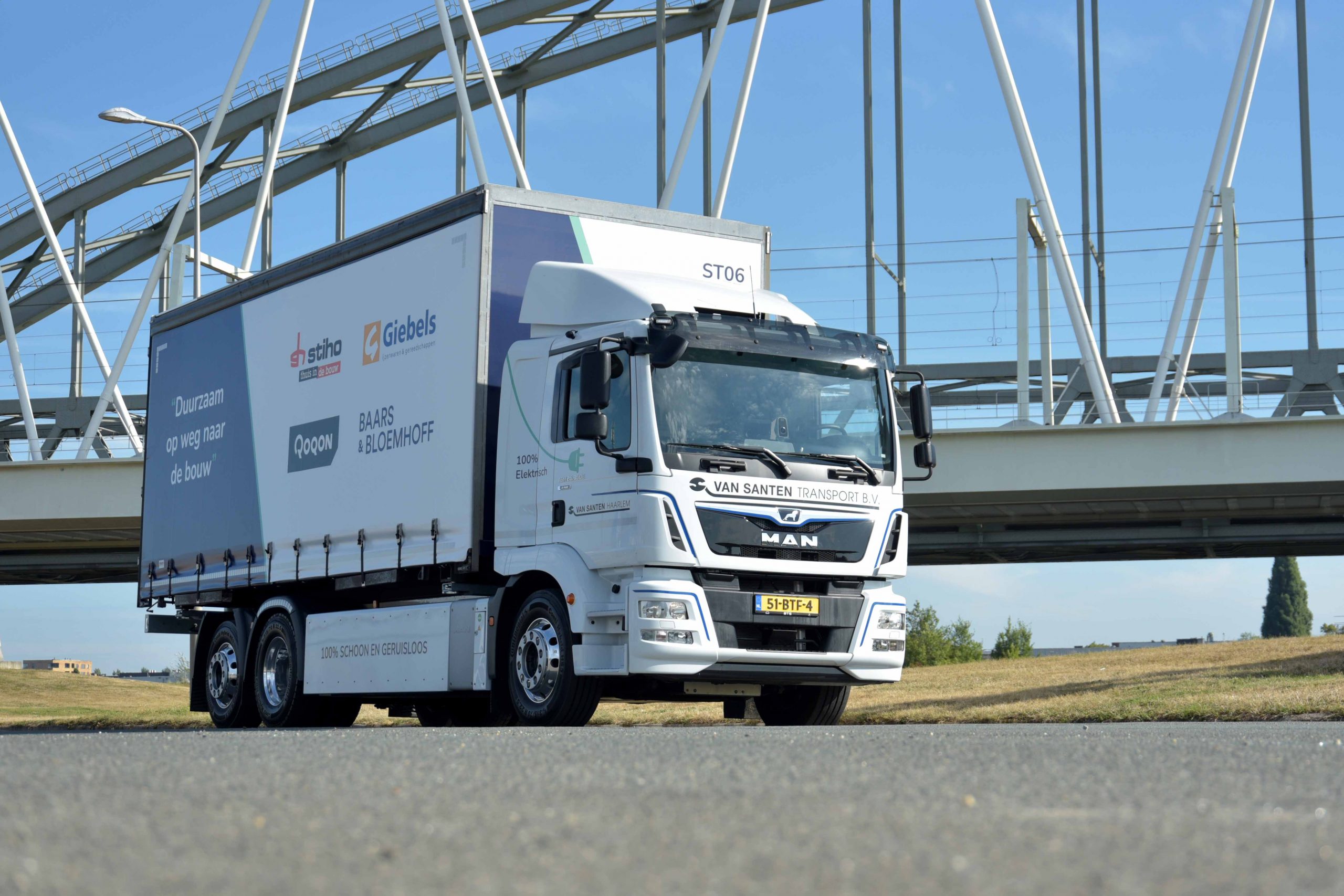 De nieuwe MAN eTGM heeft als standplaats Haarlem, van waaruit de distributie van bouwmaterialen plaatsvindt voor Haarlem en Amsterdam. De drie-assige bakwagen is voor het lossen bij de klant uitgerust met een eveneens elektrische Moffett meeneemheftruk. Baars & Bloemhoff, Stiho, Giebels en Qoqon zijn onderdeel van DSG. De samenwerking met Van Santen Transport helpt het moederbedrijf om de duurzaamheidsambities van het bedrijf te realiseren.