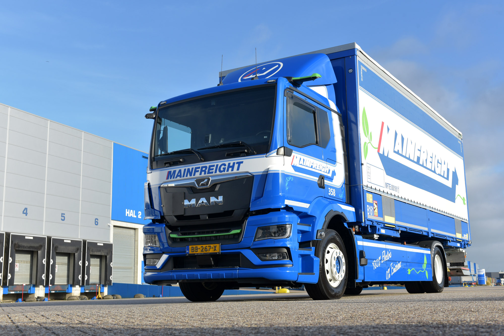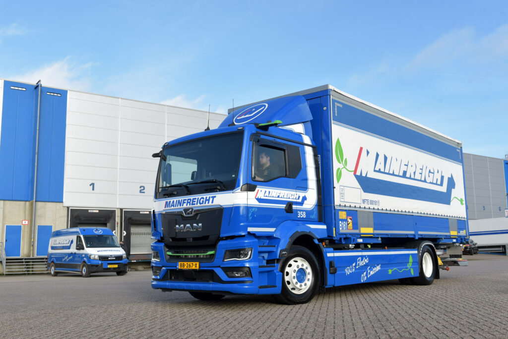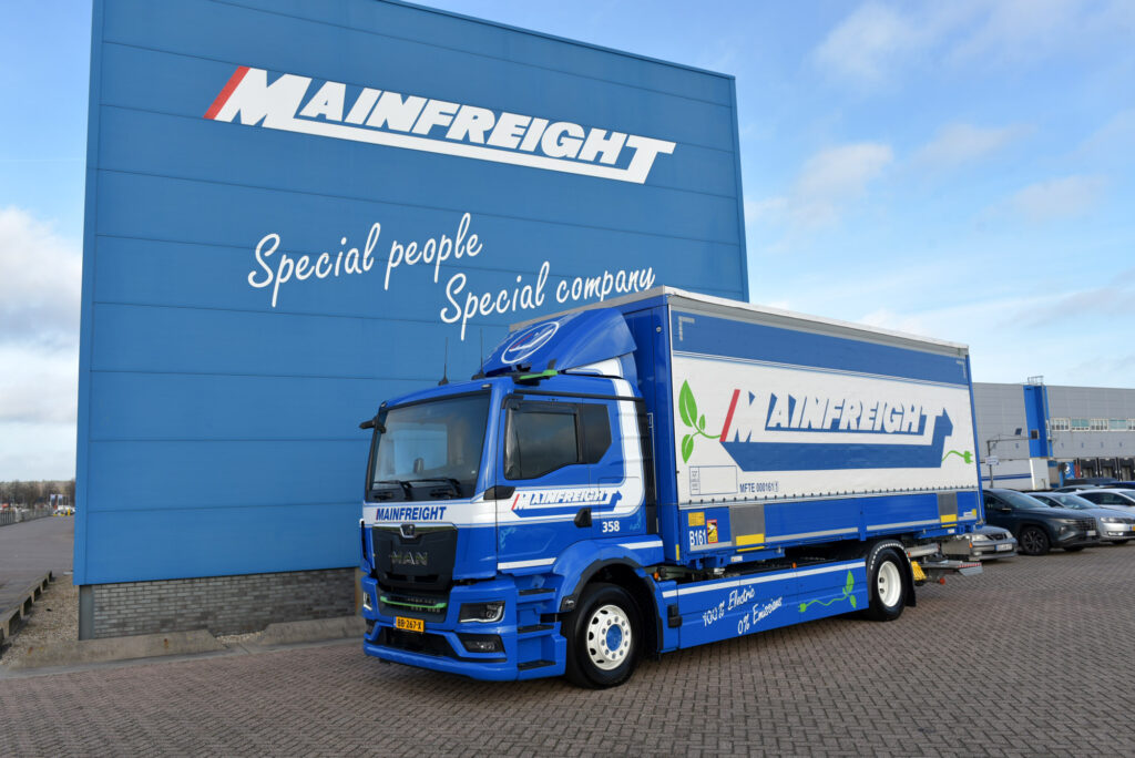 Mainfreight Transport ’s-Heerenberg heeft de eerste MAN eTGS bakwagen in Nederland in gebruik genomen. Daarmee heeft het bedrijf een primeur in huis. Met deze volledig elektrische truck kan Mainfreight tot maximaal 450 kilometer afleggen tussen de laadbeurten.
