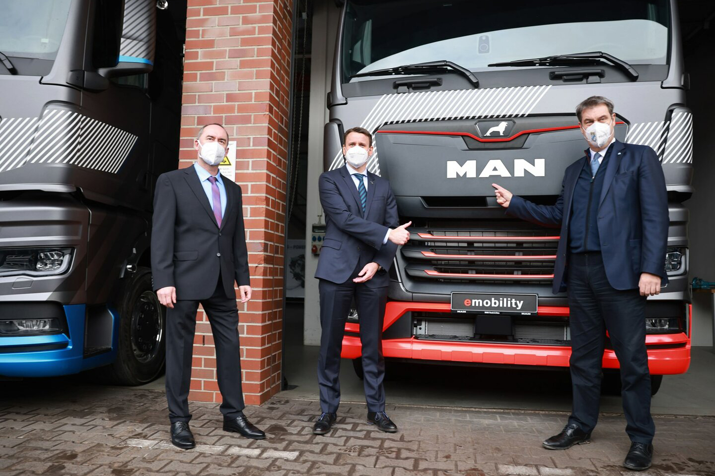 - Op de foto van links naar rechts: Hubert Aiwanger, Beierse minister van Economische Zaken, Alexander Vlaskamp, CEO MAN en Markus Söder, Beierse Minister-President voor de nieuwe elektrische TGX.