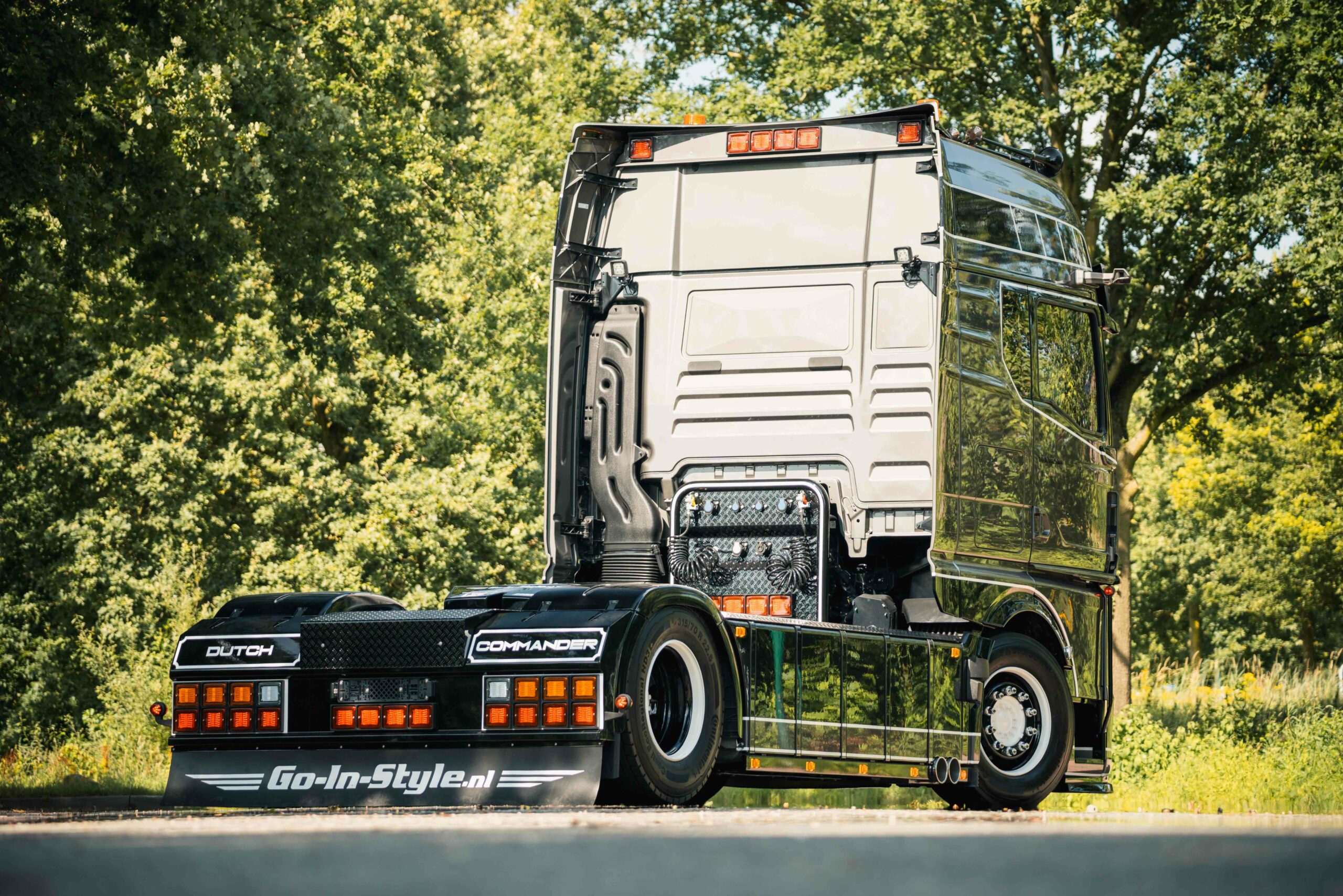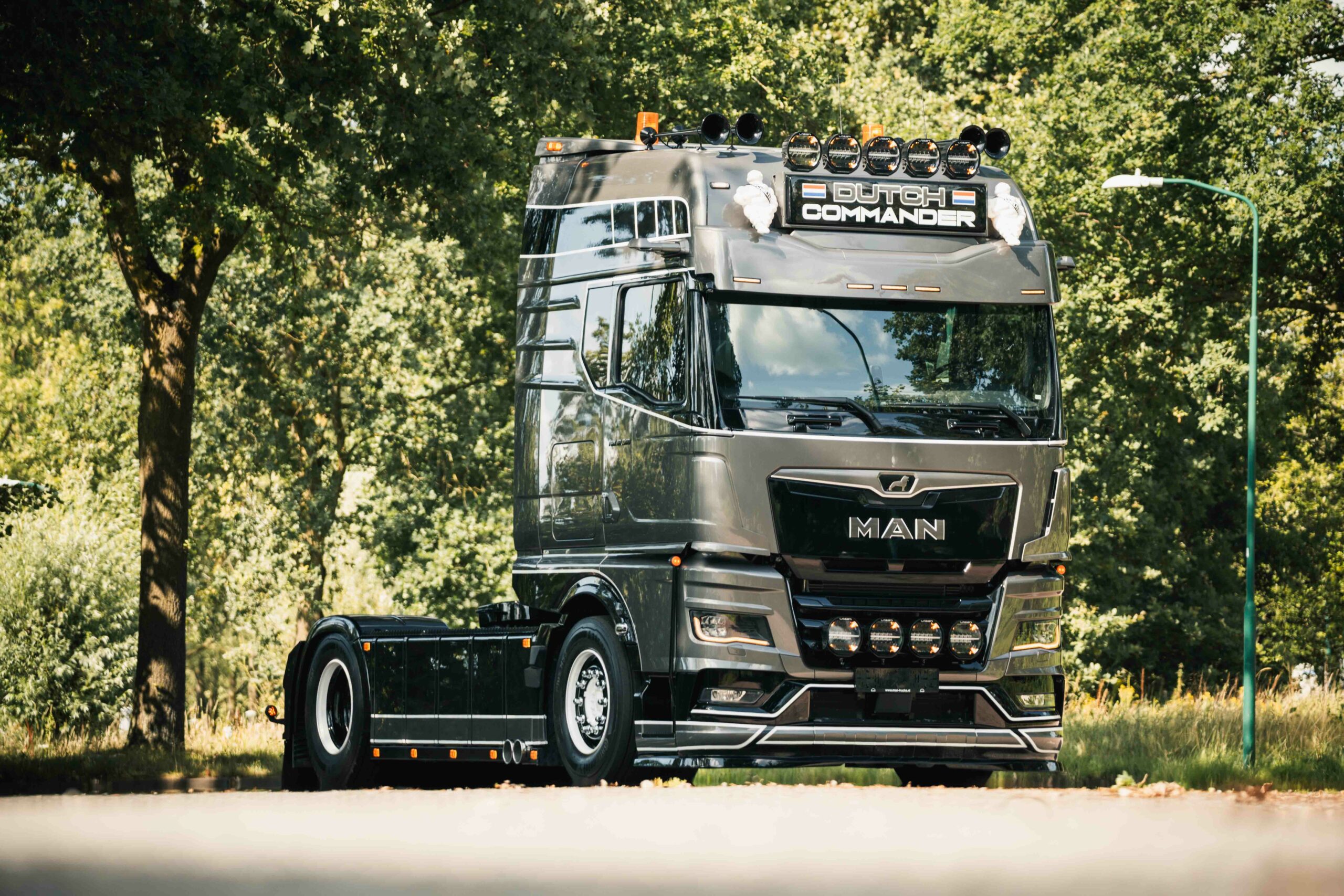 De basis van de TGX ‘Dutch Commander’ is een luchtgeveerde MAN TGX 18.510 4×2, voorzien van de ruime GX cabine. Voor de transformatie naar de zo geliefde ‘Dutch Style’ is deze TGX uitgerust met een Deense bumper, skirts met tankbanden en een volledig dichte vlonder. Andere eye catchers zijn de custom made uitlaten, het slangenrek met verlichting en een lichtlat onder de spoiler. Ook de voorzijde van de truck is stevig onder handen genomen, met een op maat gemaakte bumperspoiler en een vernieuwde variant van de verlengde zonneklep, dit keer zonder zichtbare bevestigingsbouten. Die geven deze TGX een extra stoere aanblik. De oldschool lichtbak met Michelin-poppen, de Lazer Sentinel verstralers en de vier Nedking luchthoorns maken het geheel af.