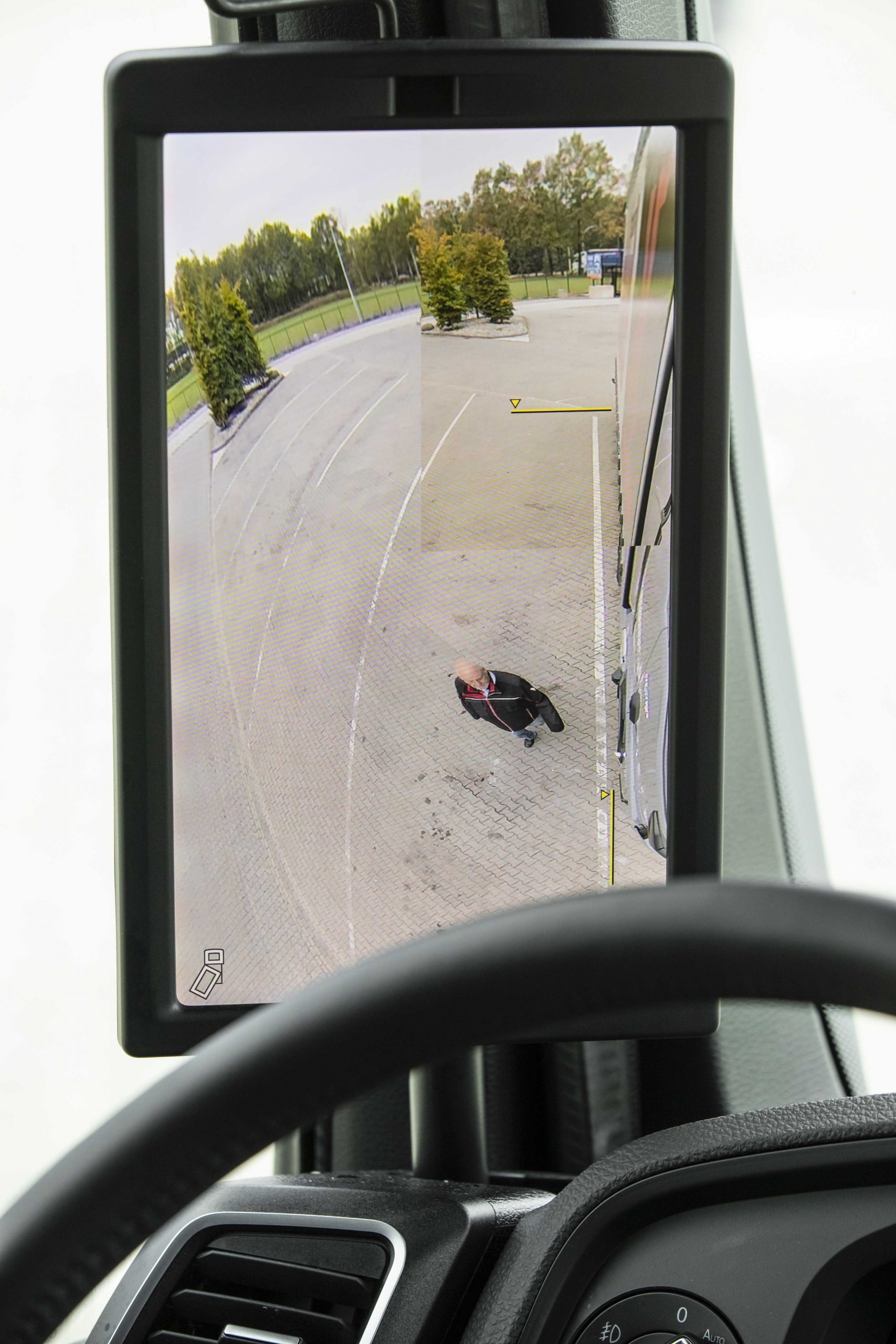 Bij MAN noemen ze het systeem OptiView en het is evenals bij veel andere merken optioneel leverbaar. Vijf camera’s vervangen niet alleen de traditionele buitenspiegels, maar ook de frontspiegel en de trottoirspiegel. Zo zitten in elk van de ‘uitsteeksels’ op de hoeken twee camera’s, waarvan het beeld wordt gecombineerd op de displays. Op de rechter A-stijl zit daarnaast nog een camera die 270 graden zicht rondom de rechter voorzijde geeft. Daarmee zie je eigenlijk alles en is er geen dode hoek meer. Het beeld daarvan is zichtbaar op het rechter display van het dashboard en komt onder een bepaalde snelheid vanzelf in beeld. Met een druk op de knop kun je het ook zelf oproepen.