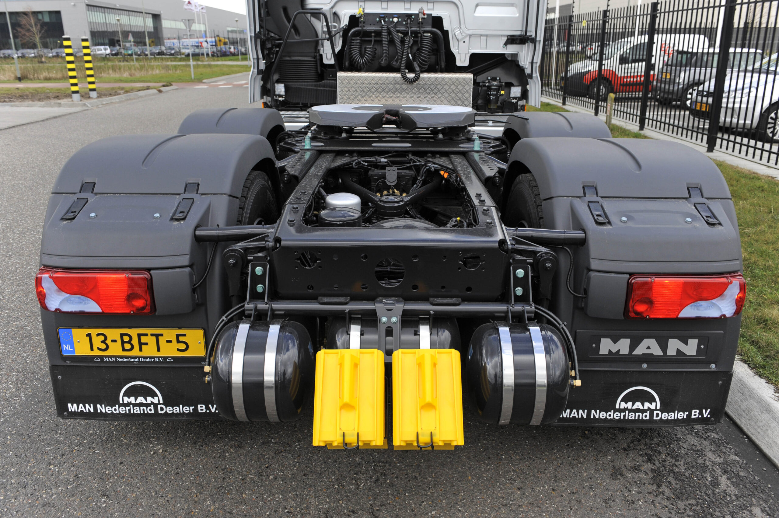 De MAN heeft een gestuurde en hefbare voorloopas en heeft – ondanks de beperkte ruimte aan het chassis – toch ruimte voor 700 liter brandstof.