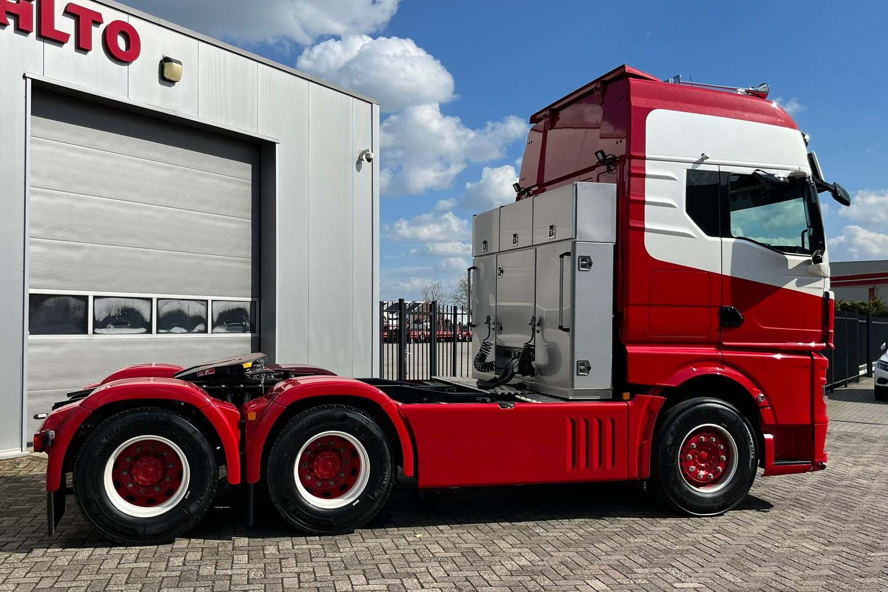 De TGX is aangepast aan de wensen van de klant en beschikt over bijna alle mogelijke opties. Met zijn robuuste 6×4 configuratie is de trekker uitgerust met een indrukwekkende kastenwand achter de cabine en op maat gemaakte zijskirts. Extra verlichting, waaronder vier lampen in de grille en twee naast de lichtbak, is toegevoegd voor optimale functionaliteit. De op maat gemaakte zonneklep, uitgerust met een staande led-bak, draagt bij aan de indrukwekkende uitstraling van deze MAN TGX.