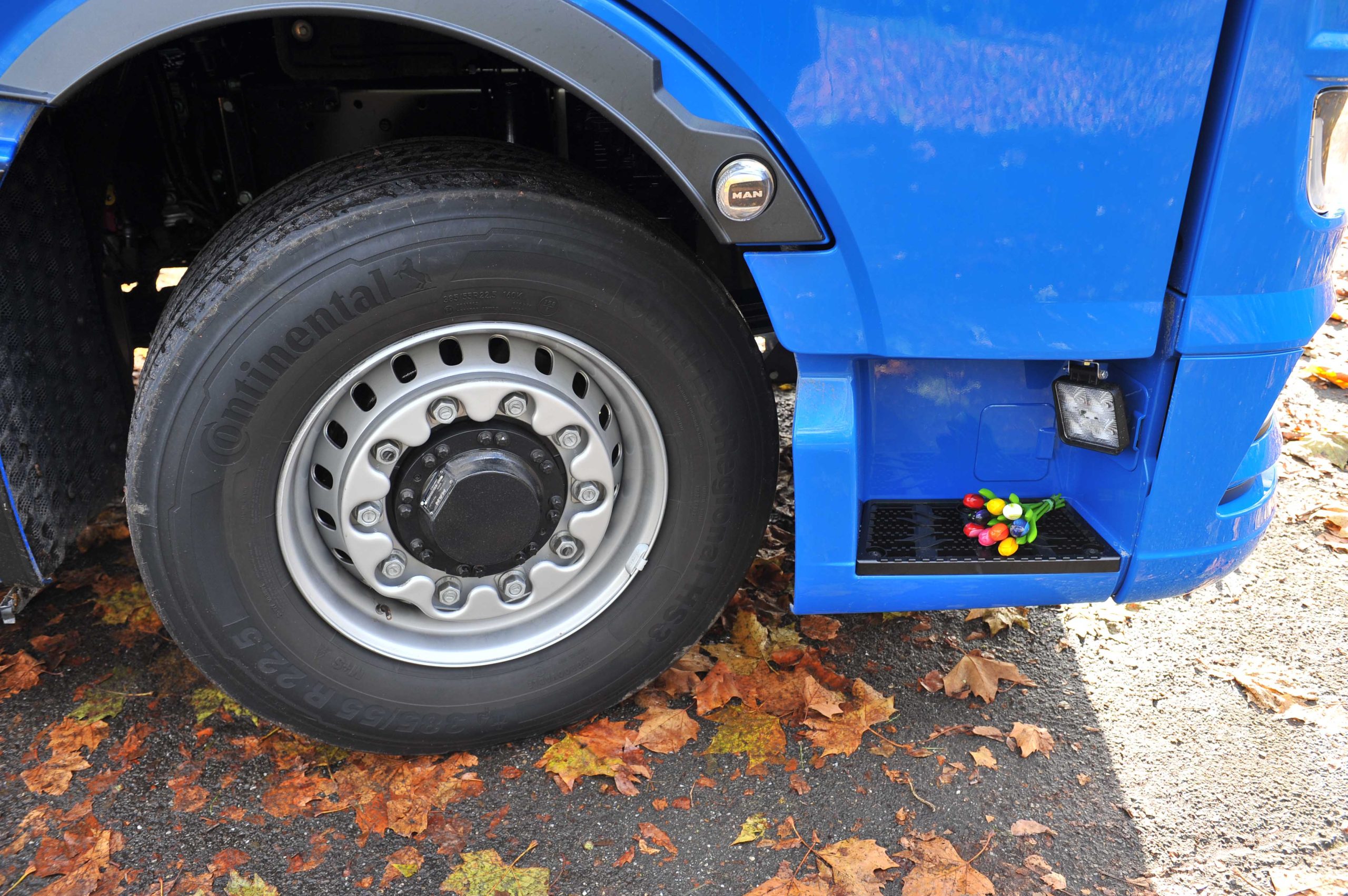 De nieuwe MAN, een TGX 28.510 6x4H-4BL, maakt deel uit van een order van achttien stuks. Jan van Berkel: “We vervingen bijna een vijfde van ons wagenpark in één keer. Dit was onderdeel van een plan waarbij we ons vrachtautopark veel efficiënter inzetten. Enerzijds vanwege wijzigingen in ons werk en anderzijds vanwege nieuwe technische mogelijkheden. In een deel van ons werk rijden we regelmatig op bospaden en andere onverharde wegen en wegbermen. Maar niet regelmatig, dus permanente, mechanische voorwielaandrijving zou teveel van het goede zijn. MAN kan af fabriek hydrodrive op de vooras leveren. Dat geeft net dat extraatje om veilig weg te komen uit een berm of een bospad.” Van Berkel kon dit systeem bestellen in combinatie met de grote GX-cabine en een automatische transmissie, en last but not least een gestuurde sleepas op de motorwagen. “Voor ons de perfecte vrachtwagen voor dit werk.”