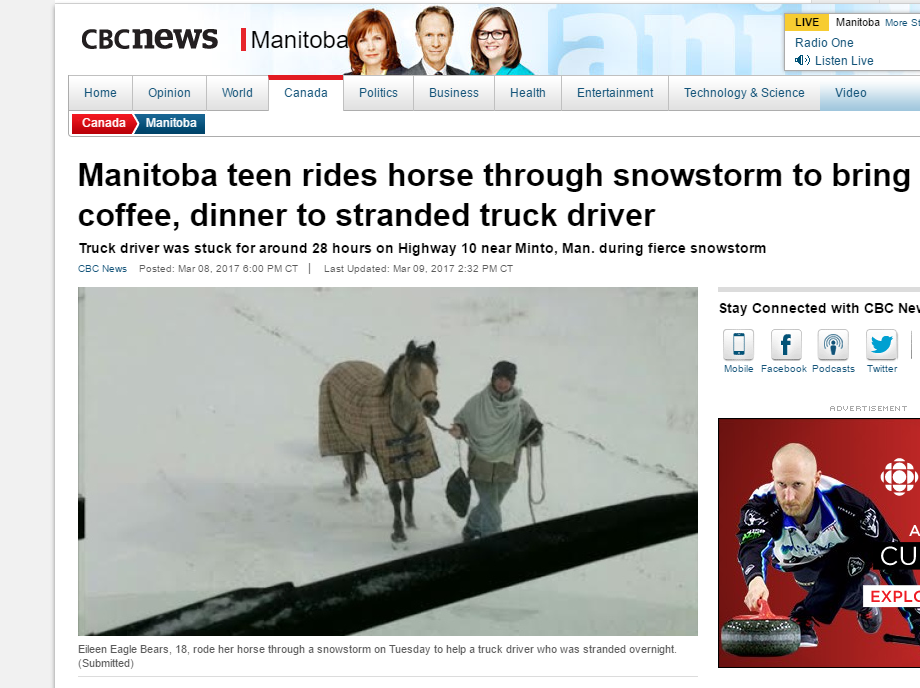 In Nederland mag het voorjaar dan al voorzichtig beginnen, in Manitoba, in het midden van Canada, is het nog volop winter. Een vrachtwagenchauffeur die vast kwam te zitten in een sneeuwstorm, werd ‘gered’ door een meisje op een paard.