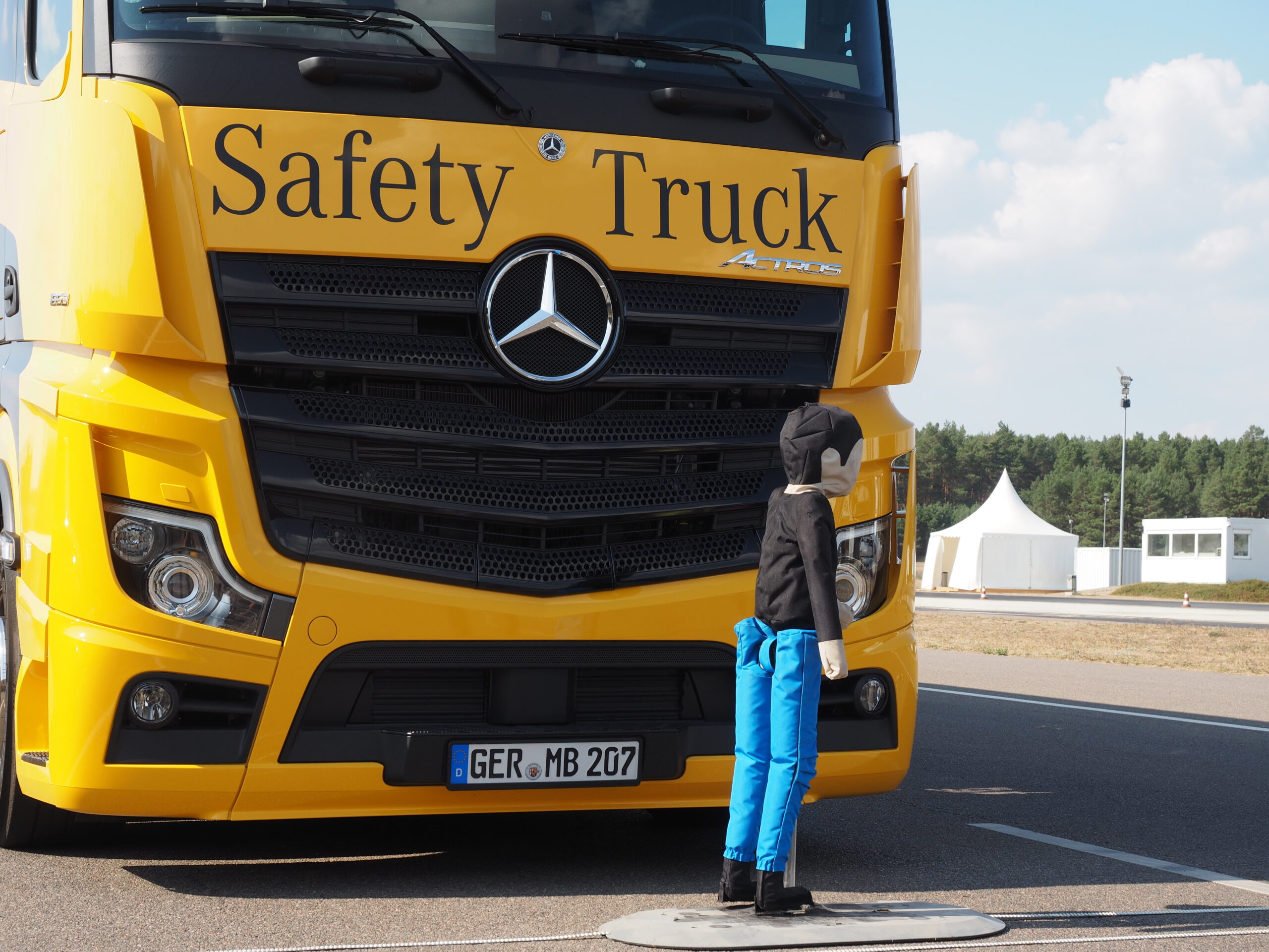 Mercedes past als eerste truckfabrikant een noodremsysteem toe dat vrachtauto’s zelfstandig tot stilstand kan brengen als er iemand onverhoeds oversteekt. Het heet ABA5, wat voor Automatic Brake Assistant van de vijfde generatie staat. Net als zijn voorganger geeft ABA eerst een alarmsignaal. Als de chauffeur niet tijdig of onvoldoende afremt, grijpt het in. Het effect is indrukwekkend.