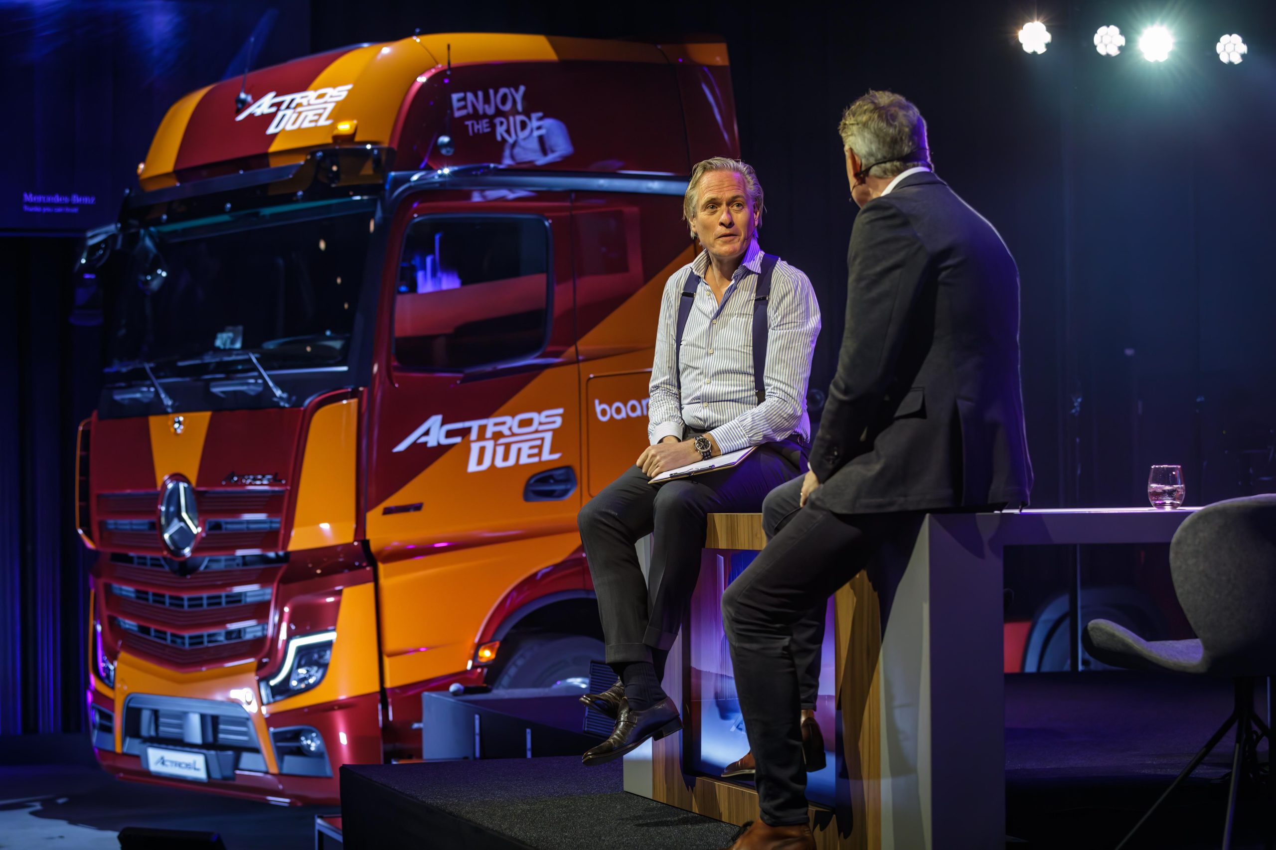- Presentator Jort Kelder (l.) in gesprek met Eric Brok, directeur Mercedes-Benz trucks.