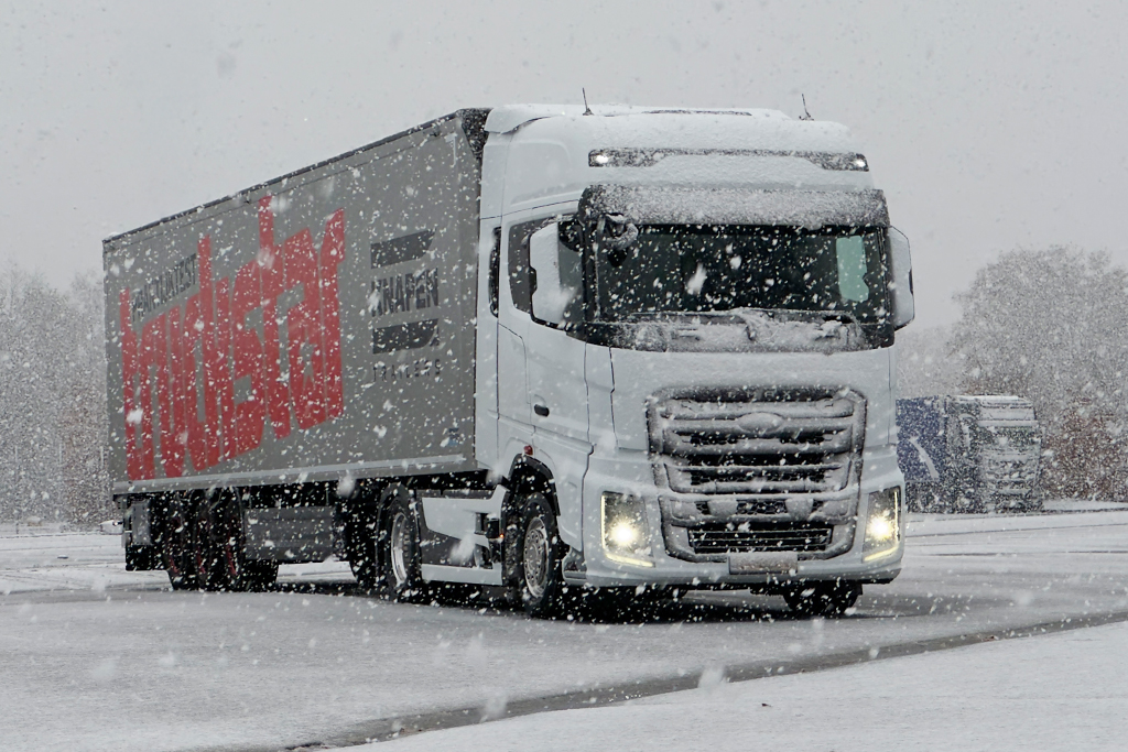 Uitgerekend nu valt er voor het eerst dit jaar enige sneeuw, met chaos op de wegen tot gevolg. We laten ons echter niet tegenhouden en gaan na een uitleg over de demo-trekker onderweg naar Deurne om onze testtrailer te halen. Met iets meer dan 300 kilometer op de teller is de Ford echt nieuw uit de doos. Heel lekker rijdt het overigens niet met een kale trekker in deze weersomstandigheden, mede door de korte wielbasis van 3,60 meter.