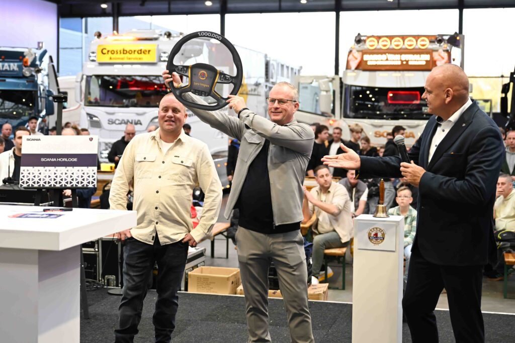 Tijdens het Mega Trucks Festival in Den Bosch kreeg Guus Lansink van Jaro Impex vandaag uit handen van Jan de Vries, Director Sales van Scania Nederland, de sleutels overhandigd van de miljoenste Scania die bij Scania Production Zwolle van de band rolde.